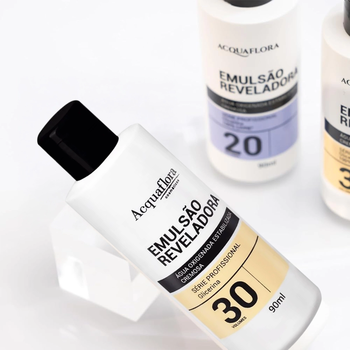 A Emulsão Reveladora Acquaflora 30 Volumes promove clareamento e coloração uniforme com segurança. Sua fórmula cremosa com glicerina hidrata e condiciona os fios durante os processos químicos, garantindo maciez, brilho e proteção à fibra capilar.