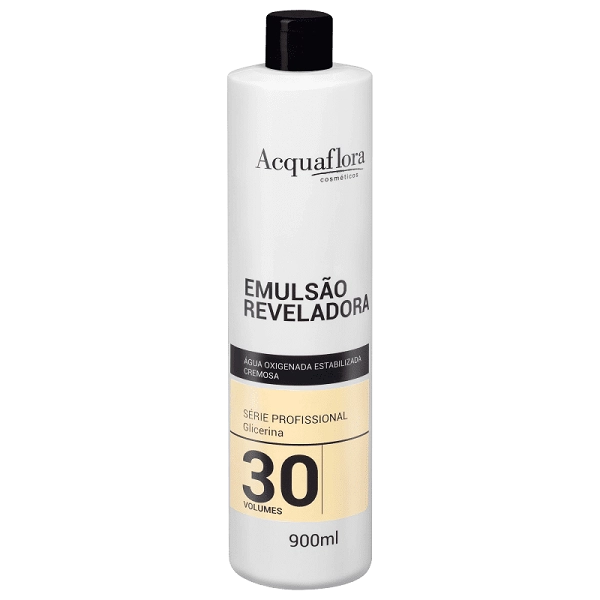 Emulsão reveladora oxidante 30 volumes. Acquaflora auxilia no processo de coloração e descoloração dos fios, além de promover condicionamento capilar. A Emulsão Reveladora Acquaflora 30 Volumes, apresenta uma água oxigenada com textura cremosa, formulada com glicerina, para promover a alteração de cor desejada do cabelo e garantir maciez após o uso. Siga atentamente os passos na embalagem e folheto explicativo do produto. Leia todas as explicações antes de começar, respeite o tempo de pausa e não pule etapas. Observações: - Este produto é para uso exclusivamente profissional. Não recomendamos que você o utilize sem o acompanhamento ou indicação de um profissional. - Antes de aplicar, faça um teste de mecha e teste de toque para verificar se o cabelo está saudável e evitar possíveis alergias. - Se você for gestante, ou estiver é fase de amamentação, procure seu médico para saber se você pode fazer a aplicação do pó descolorante. - Caso você tenha alguma ferida pré-existente no couro cabeludo, não aplique o produto sem consultar seu médico antes.
