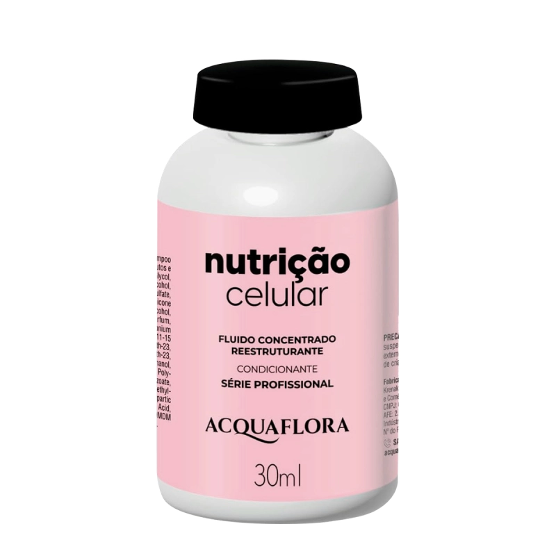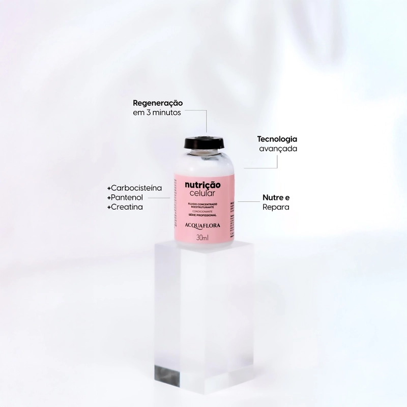 Acquaflora Nutrição Celular Fluído Concentrado - Força e Reconstrução Imediata Trata profundamente cabelos enfraquecidos ou estressados, devolvendo força e vitalidade. Enriquecida com carbocisteína, pantenol e creatina, repara a fibra capilar, repõe massa e restaura a flexibilidade natural dos fios. Conselho de Aplicação
