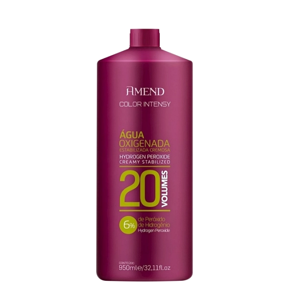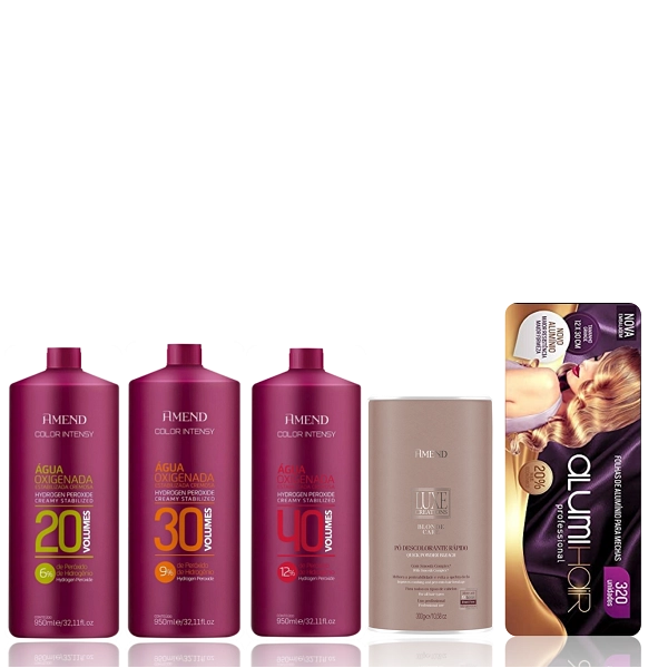 Água oxigenada profissional 20 volumes. Água Oxigenada Amend Color Intensy 20 Volume ajuda a revelar a coloração e descolorante de maneira uniforme e segura, sem danos ao fio e com o tom impecável. Água Oxigenada Color Intensy 20 Volumes, de Amend, possui fórmula estabilizada cremosa que cria misturas homogêneas e fáceis de aplicar. Tem ativos que protegem o fio durante a mudança de cor e garante o tom igual à cartela de cores. Para usar exclusivamente com a linha Color Intensy de Amend. Peróxido de Hidrogênio 6%: age em conjunto com a coloração ou pó descolorante. Auxilia na abertura das cutículas e revela tons de maneira rápida e uniforme. Água oxigenada profissional 30 volumes. Água Oxigenada Amend Color Intensy 30 Volumes revela a coloração e o descolorante de maneira uniforme e segura, com resultado impecável. Água Oxigenada Color Intensy 30 Volumes, de Amend, possui fórmula estabilizada e levemente cremosa, desenvolvida para usar em conjunto com as colorações da linha Color Intensy de Amend. Age de maneira rápida e ainda protege os fios. Peróxido de Hidrogênio 9%: age em conjunto com a coloração ou pó descolorante. Auxilia na abertura das cutículas e revela tons de maneira rápida e uniforme. Água oxigenada profissional 40 volumes. Água Oxigenada Amend Color Intensy 40 Volumes auxilia no processo de coloração e descoloração dos fios. Desenvolvida para usar especificamente com as colorações da linha Color Intensy. De consistência levemente cremosa, a Água Oxigenada Amend Color Intensy 40 Volumes possui fórmula estabilizada e garante um ótimo resultado de cor. Ajuda a revelar a coloração e clarear os tons de maneira uniforme e fiel à cartela de cores, sem causar danos profundos ao fio. Suavemente perfumada. Peróxido de Hidrogênio 12%: age em conjunto com a coloração ou pó descolorante. Auxilia na abertura das cutículas e revela tons de maneira rápida e uniforme. Pó descolorante para todos os tipos de cabelo. Amend Luxe Creations Blonde Care clareia até 9 tons, evita a quebra do fio e melhora a penteabilidade. Ação Smooth Complex: condiciona os fios, melhora a penteabilidade, reduz o risco de quebra e proporciona sedosidade. Oxigenada Siga atentamente ao passo a passo na embalagem do produto e no folheto de informação da coloração permanente. Não pule etapas e leia todas as instruções antes de iniciar o processo. Pó Descolorante Antes de começar, leia com atenção todo o passo a passo presente na embalagem e na bula do produto. Em seguida, siga à risca todas as recomendações ali presentes, sem pular etapas. Atente-se, em especial, às quantidades e ao tempo de espera indicados.Amend Color Intensy 6% Ox 20 V+9% Ox 30 V+12% 40 V 950ml+Luxe Creations Blonde Care 300g+Alumi Hair 320un
