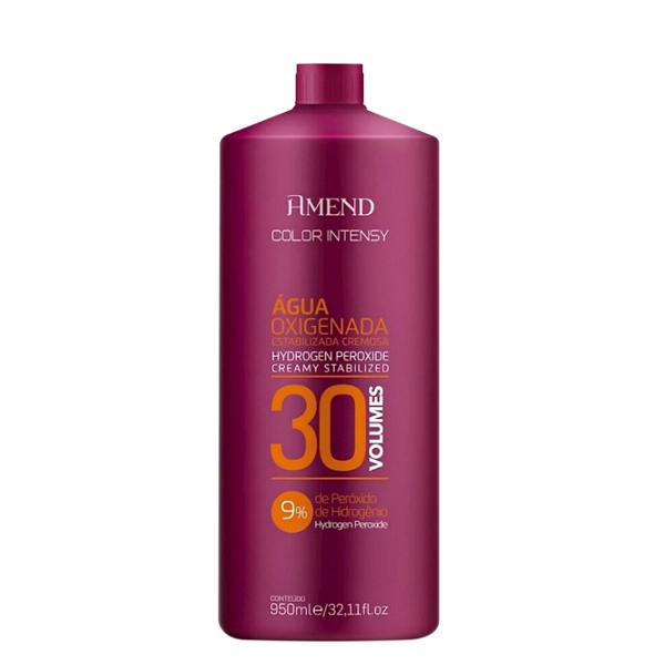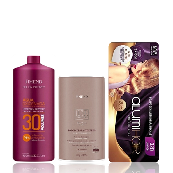 Água oxigenada profissional 30 volumes. Água Oxigenada Amend Color Intensy 30 Volumes revela a coloração e o descolorante de maneira uniforme e segura, com resultado impecável. Água Oxigenada Color Intensy 30 Volumes, de Amend, possui fórmula estabilizada e levemente cremosa, desenvolvida para usar em conjunto com as colorações da linha Color Intensy de Amend. Age de maneira rápida e ainda protege os fios. Peróxido de Hidrogênio 9%: age em conjunto com a coloração ou pó descolorante. Auxilia na abertura das cutículas e revela tons de maneira rápida e uniforme. Pó descolorante para todos os tipos de cabelo. Amend Luxe Creations Blonde Care clareia até 9 tons, evita a quebra do fio e melhora a penteabilidade. Ação Smooth Complex: condiciona os fios, melhora a penteabilidade, reduz o risco de quebra e proporciona sedosidade. Oxigenada Siga atentamente ao passo a passo na embalagem do produto e no folheto de informação da coloração permanente. Não pule etapas e leia todas as instruções antes de iniciar o processo. Pó Descolorante Antes de começar, leia com atenção todo o passo a passo presente na embalagem e na bula do produto. Em seguida, siga à risca todas as recomendações ali presentes, sem pular etapas. Atente-se, em especial, às quantidades e ao tempo de espera indicados.Amend Color Intensy 9% Ox 30 V 950ml+Luxe Creations Blonde Care 300g+Alumi Hair 320un