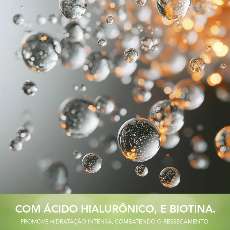 Promove hidratação intensa, combate o ressecamento e controla o frizz, enquanto sela as cutículas e repara pontas duplas. Com ácido hialurônico e biotina, fortalece os fios, estimula o crescimento e aumenta a resistência à quebra, deixando os cabelos macios, brilhantes e saudáveis.