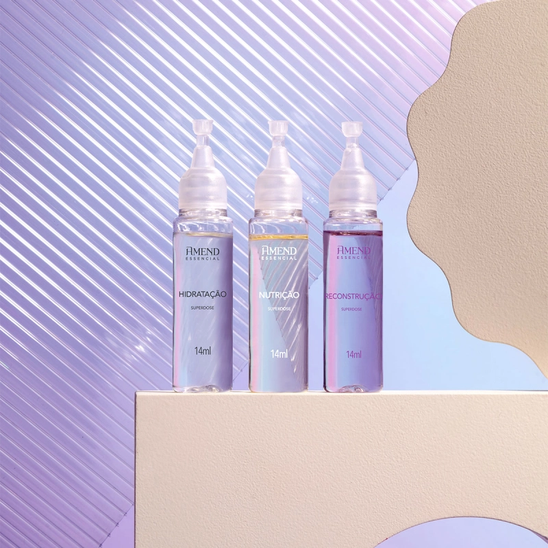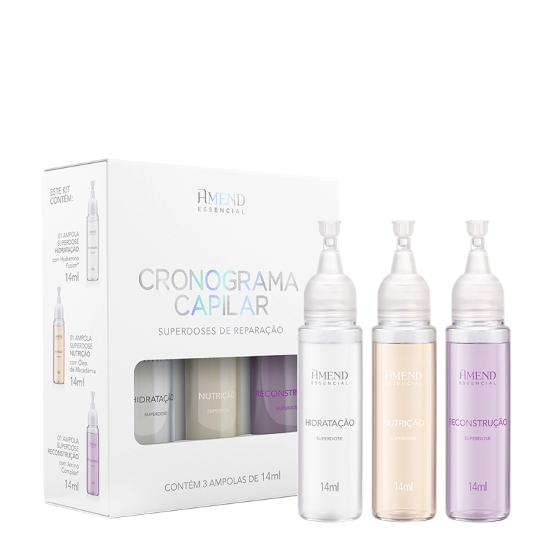 Amend Essencial Kit Cronograma Capilar - Hidratação, Nutrição e Reconstrução Amend Essencial Superdoses de Reparação Hidratação - Ampola Capilar 14ml: repõe água e nutrientes, restaurando a maciez e o brilho dos fios. Amend Essencial Superdoses de Reparação Nutrição - Ampola Capilar 14ml: nutre profundamente, reduz o frizz e fortalece a fibra capilar. Amend Essencial Superdoses de Reparação Reconstrução - Ampola Capilar 14ml: reconstrói áreas danificadas, aumenta a resistência à quebra e protege os fios. Conselho de Aplicação