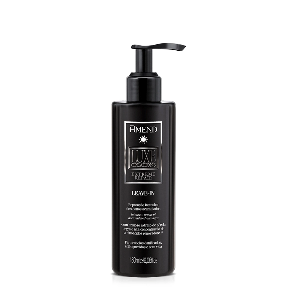 Leave-in para cabelos estressados e sem vida. Amend Luxe Creations Extreme Repair Leave-in ajuda a eliminar os sinais de envelhecimento capilar, como a fraqueza, opacidade e desidratação. Ela também evita o desbotamento da cor e combate o arrpiado. possui ação termoativa que facilita a escovação, além de contar com proteção solar na sua fórmula. Com ele, você conquista fios revitalizados, resistentes e disciplinados, verdadeiramente rejuvenescidos. Conselho de AplicaçãoAmend Luxe Creations Extreme Repair - Leave-in 180ml