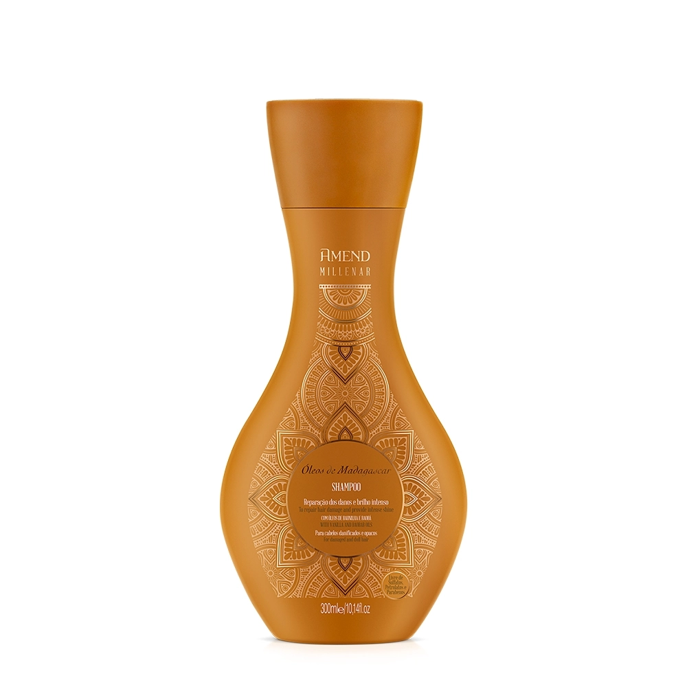 Shampoo para cabelos danificados. Amend Millenar Óleos de Madagascar limpa sem agredir enquanto proporciona reparação dos danos. é ideal para nutrir e garantir maior resistência aos fios no momento da lavagem, graças à rica combinação dos óleos de baunilha e Baobá com o potente ativo restaurador presente no Full Repair Complex. Amend Millenar Óleos de Madagascar - Shampoo 300ml