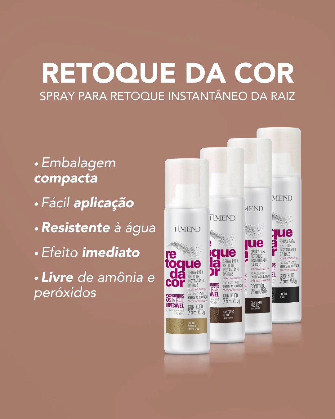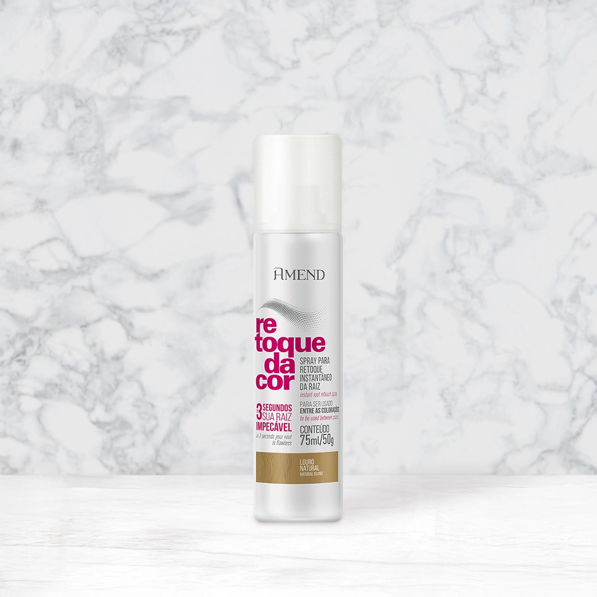 Amend Retoque da Cor 1216 Louro Natural Corretivo de raiz em spray. Amend Retoque da Cor cobre os fios brancos e desbotados em instantes, de maneira natural e prática. Perfeito para quem colore os fios com frequência. Amend Retoque da Cor foi desenvolvido para facilitar o dia a dia e cobrir os fios quando não foi possível ir ao salão. Proporciona cobertura uniforme e de longa duração. É resistente ao calor e á água, além de ser compacto e fácil de carregar e aplicar em todos os lugares. Conselho de Aplicação Agite bem o frasco antes de usar. Posicione a 15 centímetros do cabelo e borrife sobre a área que deseja colorir. Para remover, lave com shampoo e água. Antes de utilizar, faça um teste de toque. Aplique uma pequena quantidade sobre a pele limpa e aguarde 24 horas. Se não perceber nenhuma reação alérgica, prossiga com o uso.