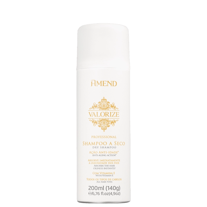 Shampoo a seco. Amend Valorize Shampoo a Seco Ação Anti-Idade absorve a oleosidade para que o cabelo fique com aspecto limpo por mais tempo. Amend Valorize Shampoo a Seco Ação Anti-Idade conta com ativos que previne o envelhecimento dos fios e assim, impedem que fiquem opacos e fragilizados. Possui uma fragrância suave e elegante. Amend Valorize Ação Anti-Idade