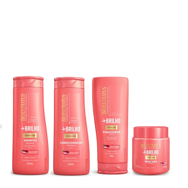 Bio Extratus Mais Brilho para Cabelos opacos, Hidrata, nutri, alinha e da brilho. Bio Extratus trouxe para seus cabelos uma fórmula exclusiva com cacau ruby, a fruta cor-de-rosa que hidrata, alinha e dá um brilho incrível. É usar e brilhar. Contém: Bio Extratus Mais Brilho - Shampoo 250ml: Promove limpeza suave que devolve o balanço natural. A combinação única de cacau ruby e polímeros de algas trata, nutre, hidrata e deixa os cabelos com muito + brilho. Bio Extratus Mais Brilho - Condicionador 250ml: Fórmula emoliente que promove condicionamento imediato. A combinação única de cacau ruby e polímeros de algas trata, nutre, hidrata e deixa os cabelos com muito + brilho. Bio Extratus Mais Brilho – Banho de Creme 250g: Promove tratamento intensivo sem pesar nos fios. A combinação única de cacau ruby e polímeros de algas trata, nutre, hidrata e deixa os cabelos com muito + brilho. Extratus Mais Brilho – Finalizador 200g: Fórmula antifrizz que protege os cabelos, deixando os fios perfeitamente alinhados. A combinação única de cacau ruby e polímeros de algas trata, nutre, hidrata e deixa os cabelos com muito + brilho. Conselho de aplicação Aplique nos cabelos molhados, massageando suavemente. Enxágue bem. Se necessário, repita a aplicação. Após lavar os cabelos, aplique a Máscara +Brilho, massageando mecha a mecha. Para intensificar o tratamento, use touca de hidratação. Deixe agir por 5 minutos. Enxágue.. Após lavar os cabelos com shampoo, aplique o Condicionador +Brilho por toda a extensão dos fios, massageando suavemente. Deixe agir por alguns minutos. Enxágue. Aplique sobre os cabelos úmidos e distribua ao longo dos fios, principalmente nas pontas e regiões mais danificadas. Não enxague. Penteie normalmente. Pode ser usado antes de escovar para proteger os fios.Bio Extratus Mais Brilho - Shampoo+Condicionador 250ml+Mascara 250g+Finalizador 200g