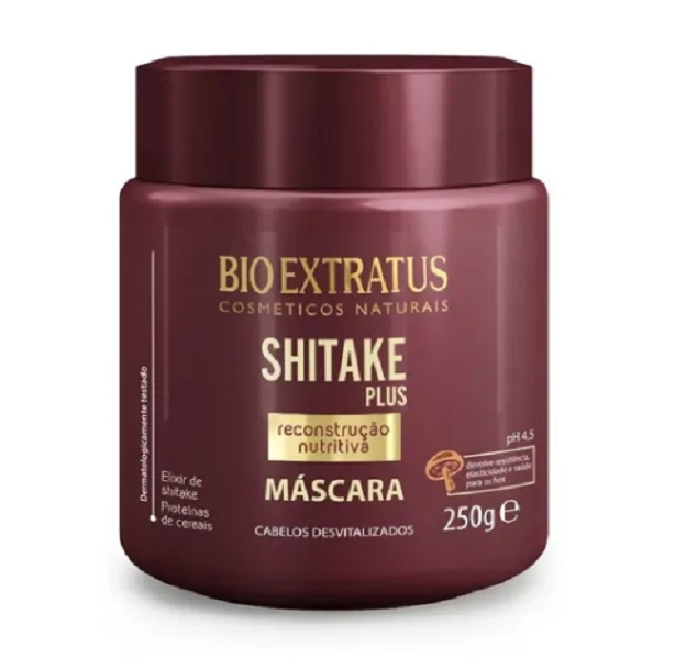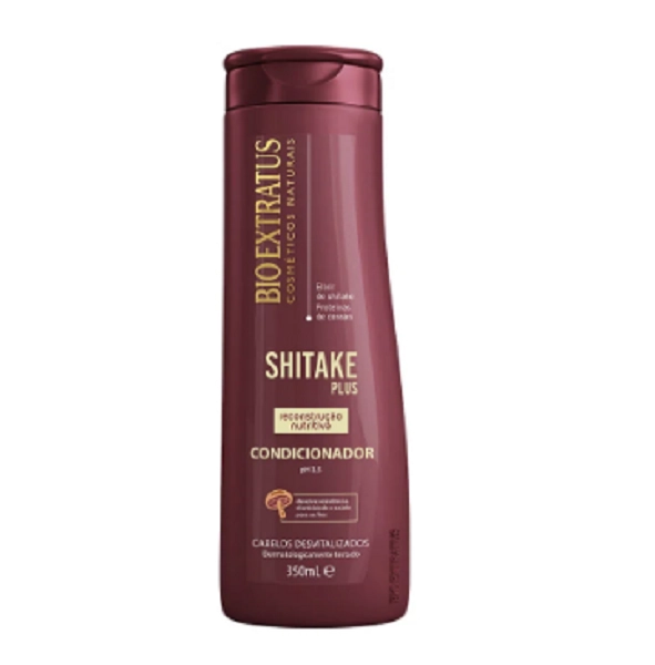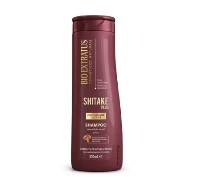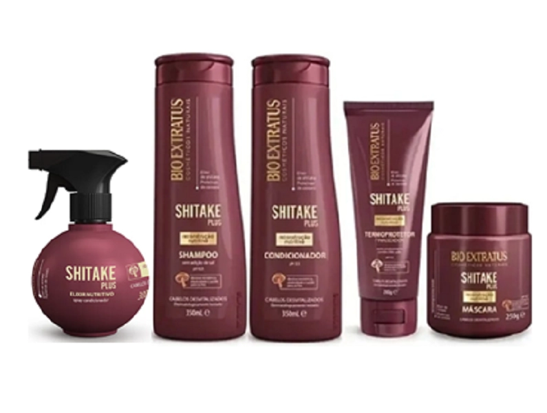 Contém: 1 Shampoo Shitake Plus 350 1 Condicionador Shitake Plus 350g 1 Mascara Shitake Plus 250g 1 Finalizador Termoprotetor Shitake Plus 200g 1 Elixir Nutritivo Spray Condicionador Shitake Plus 300ml . Shampoo Limpeza suave que dá brilho e devolve a vitalidade ao cabelo. pH 6,0. Sem adição de sal. Condicionador: Desembaraça facilmente sem danificar os fios, devolve o brilho e a vitalidade aos cabelos. pH 3,5. Elixir Nutritivo - Restaura a fibra capilar, devolvendo força e saúde ao cabelo. pH 4,5. Mascara Hidrata profundamente os fios, oferecendo os principais nutrientes essenciais à restauração da fibra capilar. Recupera a vitalidade e dá brilho intenso ao cabelo. pH 4,0. Finalizador Termoprotetor Reduz a porosidade dos fios, promovendo o alinhamento das cutículas. Protege o cabelo dos agentes externos e dá brilho intenso. pH 4,5. Contém filtro solar.Bio Extratus Shitake Plus