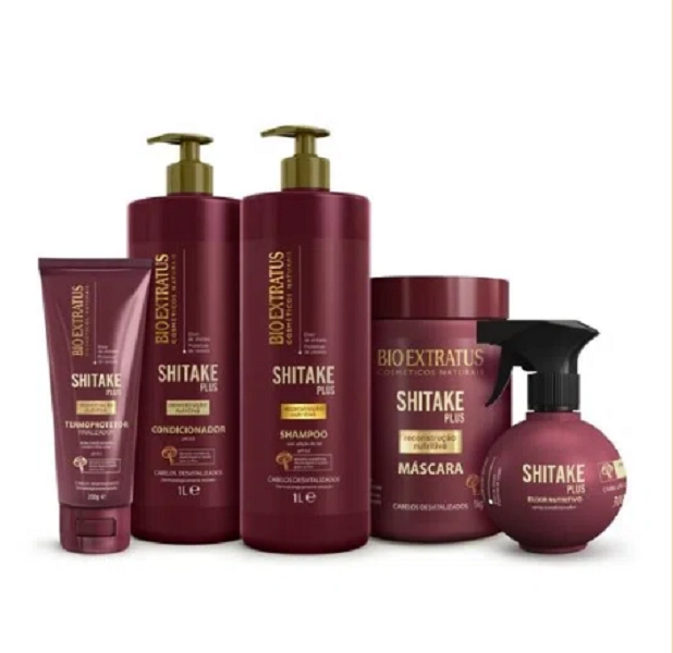 Contém: 1 Shampoo Shitake Plus 1L 1 Condicionador Shitake Plus 1L 1 Mascara Shitake Plus 1Kg 1 Finalizador Termoprotetor Shitake Plus 200g 1 Elixir Nutritivo Spray Condicionador Shitake Plus 300ml Shampoo Limpeza suave que dá brilho e devolve a vitalidade ao cabelo. pH 6,0. Sem adição de sal. Condicionador: Desembaraça facilmente sem danificar os fios, devolve o brilho e a vitalidade aos cabelos. pH 3,5. Elixir Nutritivo - Restaura a fibra capilar, devolvendo força e saúde ao cabelo. pH 4,5. Mascara Hidrata profundamente os fios, oferecendo os principais nutrientes essenciais à restauração da fibra capilar. Recupera a vitalidade e dá brilho intenso ao cabelo. pH 4,0. Finalizador Termoprotetor Reduz a porosidade dos fios, promovendo o alinhamento das cutículas. Protege o cabelo dos agentes externos e dá brilho intenso. pH 4,5. Contém filtro solar.Bio Extratus Shitake Plus