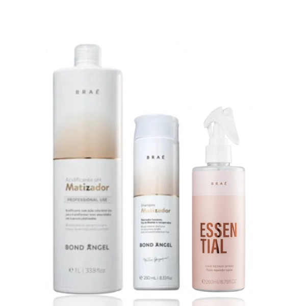 Shampoo matizador para cabelos loiros e grisalhos. BRAÉ Bond Angel Shampoo Matizador neutraliza tons amarelados e confere um efeito platino em poucos instantes. O Shampoo Matizador BRAÉ Bond Angel faz uma limpeza suave, que não agride os fios. Possui ação remineralizante e nutritiva para resgatar aspecto saudável dos cabelos, que ganham brilho e beleza. O Acidificante Matizador BRAÉ Bond Angel remove o amarelado, alinha e facilita o desembaraço dos cabelos. Assim, revela fios platinados macios, sedosos e com brilho intenso. O Leave-In BRAÉ Essential Fluido Reparador foi especialmente desenvolvido para facilitar a sua rotina de cuidados com os fios. Com formulação exclusiva e ingredientes de alta performance - como os já consagrados Ácido Hialurônico, Monoi Oil, Blend de Aminoácidos, Pantenol e Óleo de Coco -, o produto impede a ação danosa causada pelo calor emitido por ferramentas térmicas, promove brilho intenso, assegura toque macio e ainda protege de agressões externas. Aplique o acidificante mecha a mecha, desembarace os fios com o auxílio de um pente. Deixe agir de 5 a 20 minutos, conforme o tom desejado e a necessidade. Enxágue completamente. Essential agite antes de usar. Com os cabelos úmidos ou secos, aplique uma pequena quantidade de produto diretamente sobre o comprimento e pontas dos fios. Espalhe bem e finalize com como preferir. BRAÉ Bond Angel - Shampoo Matizador 250ml+Acidificante Matizador 1000ml+Essential 260ml