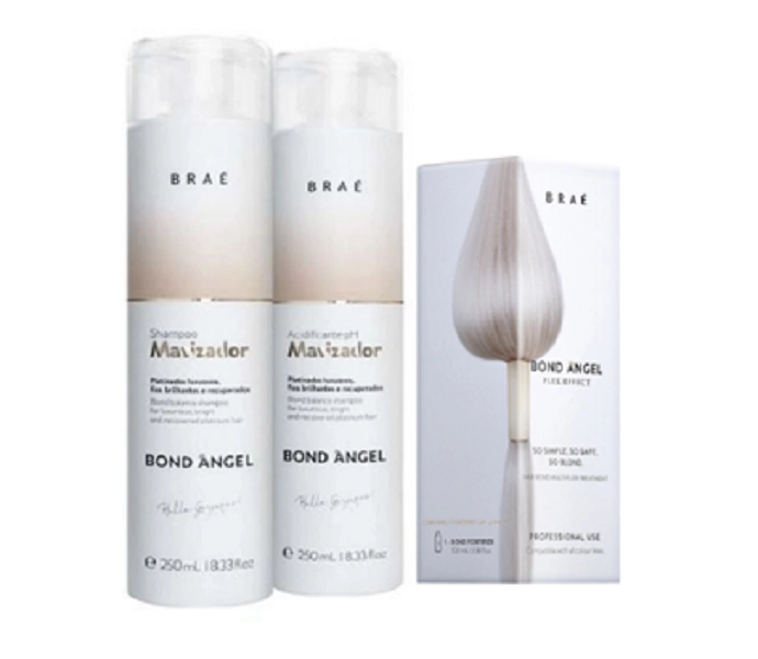 Kit Contém: 1 Shampoo Matizador 250ml 1 Acidificante Matizador 250ml 1 Plex Efect 100ml Shampoo: Shampoo matizador para cabelos loiros e grisalhos. Neutraliza tons amarelados e confere um efeito platino em poucos instantes. O Shampoo faz uma limpeza suave, que não agride os fios. Possui ação remineralizante e nutritiva para resgatar aspecto saudável dos cabelos, que ganham brilho e beleza. Aplique o shampoo e espalhe uniformemente por todo o cabelo. Deixe agir por 5 minutos, no máximo. Enxágue completamente. Evite ao máximo ultrapassar o tempo de 5 minutos de pausa do shampoo matizador. Aumentar o tempo de ação do produto pode manchar o cabelo. Acidificante: Remove o amarelado, alinha e facilita o desembaraço dos cabelos. Assim, revela fios platinados macios, sedosos e com brilho intenso. Aplique mecha a mecha, desembarace os fios com o auxílio de um pente. Deixe agir de 5 a 20 minutos, conforme o tom desejado e a necessidade. Enxágue completamente. Evite ao máximo ultrapassar o tempo de pausa do matizador. Aumentar o tempo de ação do produto pode manchar o cabelo. Fortificando pós-quimica Bond Fortifier possui um blend de micro moléculas hidrolizadas que é absorvido com mais facilidade pelos fios, atuando na recuperação da fibra capilar e aumentando a resistência sobre qualquer tensão causada por produtos químicos. Conselho de Aplicação Distribua o Bond Fortifier mecha a mecha, começando pelas pontas. Massageie suavemente até chegar próximo à raiz. Deixe agir de 10 a 15 minutos. Enxágue. Finalize como desejar. (O Bond Fortifier deve ser usado somente duas vezes por semana). Utilize o Bond Angel Fortifier 15 dias antes de realizar processos químicos nos fios para fortalecer a fibra capilar. Brae Bond Angel Matizador pH