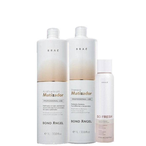 BRAÉ Bond Angel Shampoo matizador para cabelos loiros e grisalhos. BRAÉ Bond Angel Shampoo Matizador neutraliza tons amarelados e confere um efeito platino em poucos instantes. O Shampoo Matizador BRAÉ Bond Angel faz uma limpeza suave, que não agride os fios. Possui ação remineralizante e nutritiva para resgatar aspecto saudável dos cabelos, que ganham brilho e beleza. Ação Tecnologia BAP 5000: com micropartículas de extrato de açaí, acerola, uva, queratina e pantenol, neutraliza o amarelado, hidrata e restaura a resistência dos fios. O Acidificante Matizador BRAÉ Bond Angel remove o amarelado, alinha e facilita o desembaraço dos cabelos. Assim, revela fios platinados macios, sedosos e com brilho intenso. Ação Tecnologia BAP 5000: com micropartículas de extrato de açaí, acerola, uva, queratina e pantenol, neutraliza o amarelado, hidrata e restaura a resistência dos fios. Conselho de Aplicação Aplique o shampoo e espalhe uniformemente por todo o cabelo. Deixe agir por 5 minutos, no máximo. Enxágue completamente. Nossos Experts Ensinam Evite ao máximo ultrapassar o tempo de 5 minutos de pausa do shampoo matizador. Aumentar o tempo de ação do produto pode manchar o cabelo. Saiba mais: O hair stylist Ronan Gedeoni conta os 4 segredos do cabelo loiro perfeito. Resultado Seu loiro fica livre do amarelado indesejável, com brilho platinado e aparência saudável. Conselho de Aplicação O acidificante aplique mecha a mecha, desembarace os fios com o auxílio de um pente. Deixe agir de 5 a 20 minutos, conforme o tom desejado e a necessidade. Enxágue completamente. Nossos Experts Ensinam Evite ao máximo ultrapassar o tempo de pausa do matizador. Aumentar o tempo de ação do produto pode manchar o cabelo. Saiba mais: O hair stylist Ronan Gedeoni conta os 4 segredos do cabelo loiro perfeito. Resultado Seu loiro fica livre do amarelado indesejável, com brilho platinado e aparência saudável. BRAÉ So Fresh - Shampoo a Seco Vegano 150ml Conselho de Aplicação Agite bem antes de cada aplicação. Posicione o jato a 30cm dos cabelos e pulverize uniformemente sobre os fios em direção à raiz. Massageie a raiz com as pontas dos dedos e escove para eliminar o excesso. Reaplicar se necessário.Brae Bond Angel Matizador Duo Salon e So Fresh 150ml