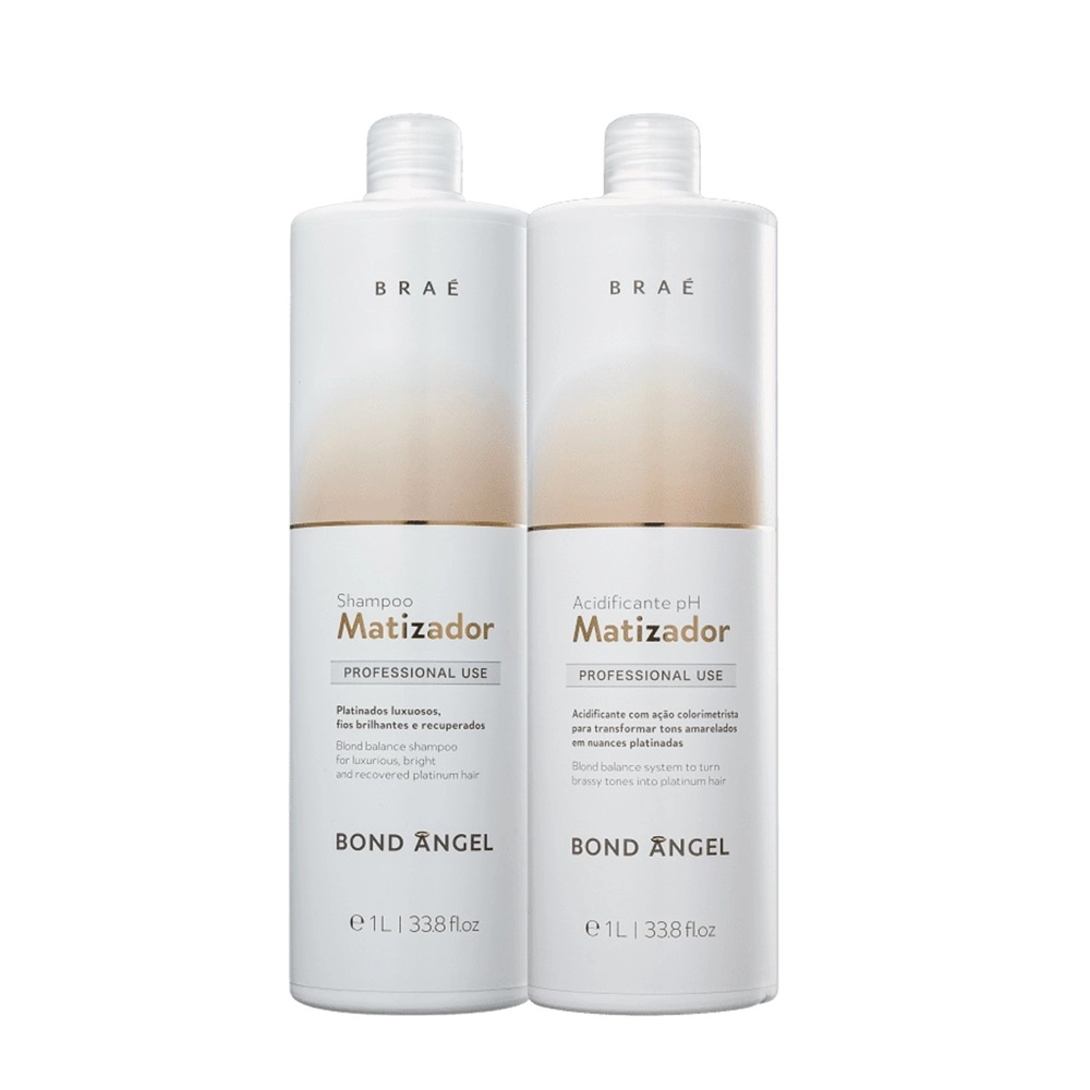 Brae Bond Angel Matizador pH Shampoo+Acidificante 1L BRAÉ Bond Angel Shampoo matizador para cabelos loiros e grisalhos. BRAÉ Bond Angel Shampoo Matizador neutraliza tons amarelados e confere um efeito platino em poucos instantes. O Shampoo Matizador BRAÉ Bond Angel faz uma limpeza suave, que não agride os fios. Possui ação remineralizante e nutritiva para resgatar aspecto saudável dos cabelos, que ganham brilho e beleza. Ação Tecnologia BAP 5000: com micropartículas de extrato de açaí, acerola, uva, queratina e pantenol, neutraliza o amarelado, hidrata e restaura a resistência dos fios. O Acidificante Matizador BRAÉ Bond Angel remove o amarelado, alinha e facilita o desembaraço dos cabelos. Assim, revela fios platinados macios, sedosos e com brilho intenso. Ação Tecnologia BAP 5000: com micropartículas de extrato de açaí, acerola, uva, queratina e pantenol, neutraliza o amarelado, hidrata e restaura a resistência dos fios. Conselho de Aplicação Aplique o shampoo e espalhe uniformemente por todo o cabelo. Deixe agir por 5 minutos, no máximo. Enxágue completamente. Nossos Experts Ensinam Evite ao máximo ultrapassar o tempo de 5 minutos de pausa do shampoo matizador. Aumentar o tempo de ação do produto pode manchar o cabelo. Saiba mais: O hair stylist Ronan Gedeoni conta os 4 segredos do cabelo loiro perfeito. Resultado Seu loiro fica livre do amarelado indesejável, com brilho platinado e aparência saudável. Conselho de Aplicação O acidificante aplique mecha a mecha, desembarace os fios com o auxílio de um pente. Deixe agir de 5 a 20 minutos, conforme o tom desejado e a necessidade. Enxágue completamente. Nossos Experts Ensinam Evite ao máximo ultrapassar o tempo de pausa do matizador. Aumentar o tempo de ação do produto pode manchar o cabelo. Saiba mais: O hair stylist Ronan Gedeoni conta os 4 segredos do cabelo loiro perfeito. Resultado Seu loiro fica livre do amarelado indesejável, com brilho platinado e aparência saudável.