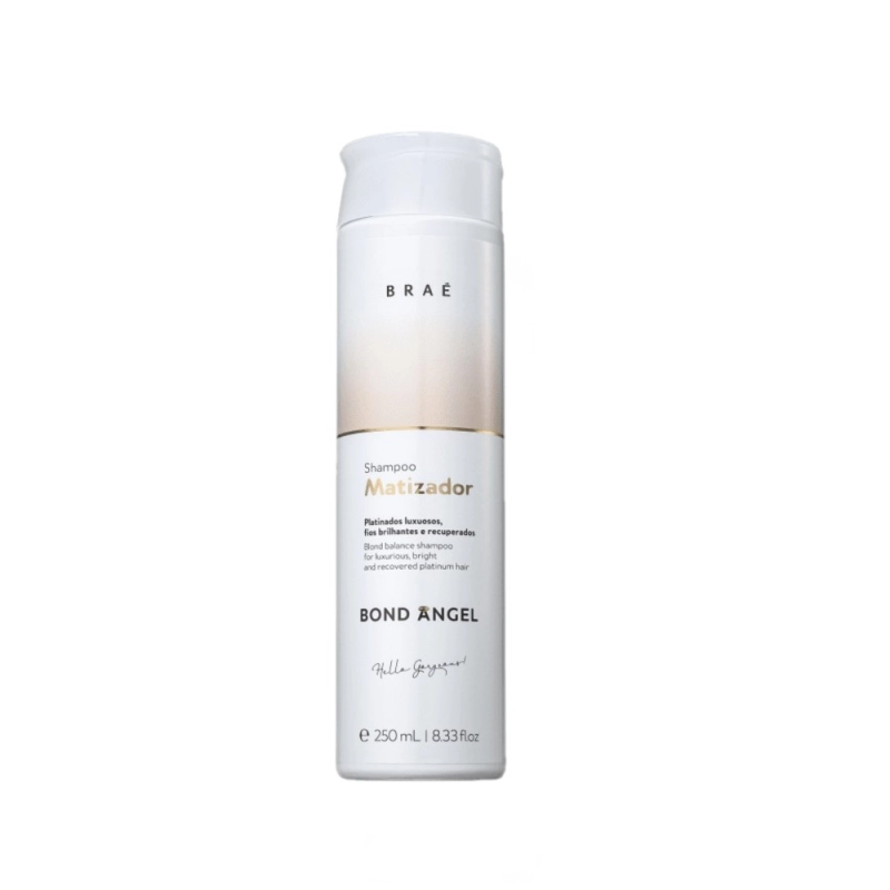 Shampoo matizador para cabelos loiros e grisalhos. BRAÉ Bond Angel Shampoo Matizador neutraliza tons amarelados e confere um efeito platino em poucos instantes. O Shampoo Matizador BRAÉ Bond Angel faz uma limpeza suave, que não agride os fios. Possui ação remineralizante e nutritiva para resgatar aspecto saudável dos cabelos, que ganham brilho e beleza.Braé Professional Use Shampoo Matizador 250ml