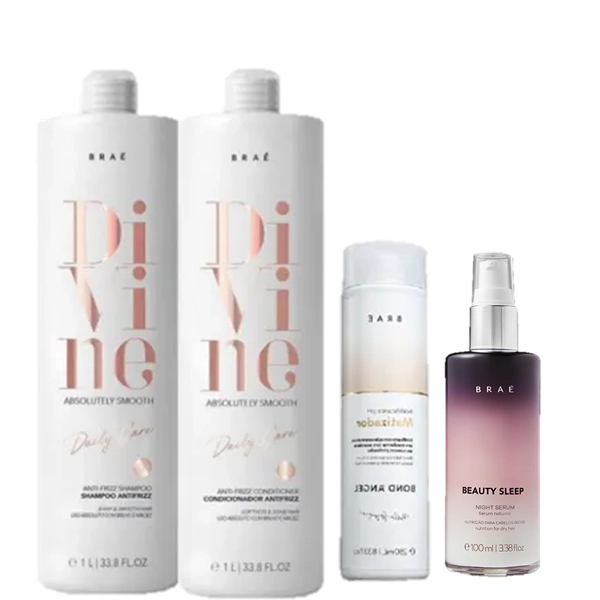 BRAÉ Divine Anti-frizz Duo Salon Bond Angel Matizador 250ml e Beauty Sleep 100ml Contém BRAÉ Divine - Shampoo 1L BRAÉ Divine - Condicionador 1L Bond Angel pH - Acidificante 250ml BRAÉ Beauty Sleep Night Serum Tratamento Noturno nutre intensamente e protege das agressões externas. Kit BRAÉ Divine Duo Kit para cabelos com frizz. O Kit BRAÉ Divine Duo confere disciplina, desembaraço e hidratação aos fios durante o dia a dia. O Kit BRAÉ Divine Duo combina ativos com tecnologias para eliminar o volume e proporcionar um cabelo mais controlado. É perfeito para quem já tem química e deseja manter o efeito liso duradouro. Conselho de Aplicação Aplique o shampoo nos cabelos molhados e massageie o couro cabeludo até formar espuma. Enxágue. Repita o procedimento se sentir necessidade. Espalhe o condicionador sobre os fios úmidos depois de usar o shampoo. Comece pelas pontas, massageie suavemente e deslize os fios entre os dedos até que estejam desembaraçados. Deixe agir por alguns minutos e enxágue. Acidificante Matizador BRAÉ Bond Angel O Acidificante Matizador BRAÉ Bond Angel remove o amarelado, alinha e facilita o desembaraço dos cabelos. Assim, revela fios platinados macios, sedosos e com brilho intenso. Aplique mecha a mecha, desembarace os fios com o auxílio de um pente. Deixe agir de 5 a 20 minutos, conforme o tom desejado e a necessidade. Enxágue completamente. Evite ao máximo ultrapassar o tempo de pausa do matizador. Aumentar o tempo de ação do produto pode manchar o cabelo. BRAÉ Beauty Sleep Night Serum Tratamento Noturno Sérum de tratamento noturno para cabelos ressecados e secos. BRAÉ Beauty Sleep Night Serum Tratamento Noturno nutre intensamente e protege das agressões externas. Conselho de aplicação usar à noite antes de dormir, aplique no comprimento e pontas dos cabelos úmidos ou secos com uma quantidade adequada para cobrir os fios. Se aplicar no cabelo molhado, seque-o primeiro com uma toalha, massageie suavemente até completa absorção, reaplique conforme necessário para nutrição adicional à noite. Conselho de Aplicação