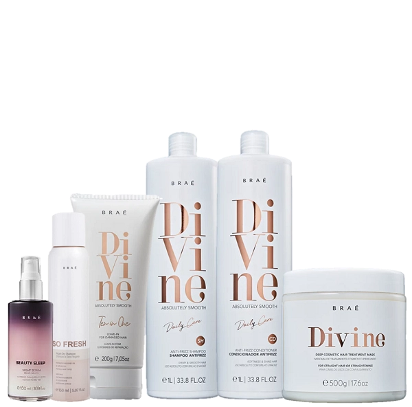 Shampoo para cabelos com frizz. BRAÉ Divine Shampoo deixa os fios mais alinhados e disciplinados durante a limpeza. .O Shampoo Divine BRAÉ combina ativos com tecnologias para eliminar o volume e proporcionar um cabelo mais controlado. É perfeito para quem já tem química e deseja manter o efeito liso duradouro. Condicionador para cabelos com frizz. BRAÉ Divine Condicionador traz um cuidado hidratante que desembaraça e disciplina os fios rebeldes. .O Condicionador Divine BRAÉ combina ativos com tecnologias para eliminar o volume e proporcionar um cabelo mais controlado. É perfeito para quem já tem química e deseja manter o efeito liso duradouro. .Máscara de tratamento para cabelos lisos ou quimicamente tratados. BRAÉ Divine nutre intensamente, restaura e alinha. Máscara BRAÉ Divine Treatment Capilar também fortalece, proporciona maciez e um tratamento profundo enquanto recupera o brilho e a maleabilidade. Ideal para prolongar o efeito liso, tratar as camadas mais externas do fio e hidratar completamente. .Leave-in para cabelos danificados. BRAÉ Divine Ten in One apresenta 10 poderes de reparação em um único produto. Leave-in BRAÉ Divine Ten in One proporciona hidratação, ação antifrizz, força, proteção térmica, maciez, brilho, proteção UV, ação antiquebra e maleabilidade. Além disso, garante uma modelagem leve nos fios. Com ele, seu cabelo fica revitalizado e nutrido. BRAÉ So Fresh - Shampoo a Seco Vegano 150ml 1-Aplique o shampoo nos cabelos molhados e massageie o couro cabeludo até formar espuma. Enxágue. Repita o procedimento se sentir necessidade. Nossos Experts Ensinam A água fria ajuda a fechar as cutículas do cabelo, o que diminui o atrito entre os fios e, portanto, evita o frizz. Prefira lavar o cabelo com água morna e aproveite para dar um último enxágue com água fria. 2-Espalhe o condicionador sobre os fios úmidos depois de usar o shampoo. Comece pelas pontas, massageie suavemente e deslize os fios entre os dedos até que estejam desembaraçados. Deixe agir por alguns minutos e enxágue. 3-Com os cabelos limpos e úmidos, aplique a máscara capilar, mecha a mecha, e massageie suavemente. Deixe agir durante 20 minutos. Em seguida, enxágue bem. 4-Aplique o leave-in diretamente no comprimento e pontas do cabelo seco ou úmido. Não necessita de enxágue. Finalize como desejar. 5- usar à noite antes de dormir, aplique no comprimento e pontas dos cabelos úmidos ou secos com uma quantidade adequada para cobrir os fios. Se aplicar no cabelo molhado, seque-o primeiro com uma toalha, massageie suavemente até completa absorção, reaplique conforme necessário para nutrição adicional à noite. 6- Agite bem antes de cada aplicação. Posicione o jato a 30cm dos cabelos e pulverize uniformemente sobre os fios em direção à raiz. Massageie a raiz com as pontas dos dedos e escove para eliminar o excesso. Reaplicar se necessário.BRAÉ Divine Duo 1L Mascara 500g Leave in 200g Beauty Sleep 100ml e So Fresh 150ml