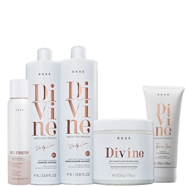 BRAÉ Divine Duo 1L Mascara 500g Leave in 200g e So Fresh 150ml Shampoo para cabelos com frizz. BRAÉ Divine Shampoo deixa os fios mais alinhados e disciplinados durante a limpeza. .O Shampoo Divine BRAÉ combina ativos com tecnologias para eliminar o volume e proporcionar um cabelo mais controlado. É perfeito para quem já tem química e deseja manter o efeito liso duradouro. Condicionador para cabelos com frizz. BRAÉ Divine Condicionador traz um cuidado hidratante que desembaraça e disciplina os fios rebeldes. .O Condicionador Divine BRAÉ combina ativos com tecnologias para eliminar o volume e proporcionar um cabelo mais controlado. É perfeito para quem já tem química e deseja manter o efeito liso duradouro. .Máscara de tratamento para cabelos lisos ou quimicamente tratados. BRAÉ Divine nutre intensamente, restaura e alinha. Máscara BRAÉ Divine Treatment Capilar também fortalece, proporciona maciez e um tratamento profundo enquanto recupera o brilho e a maleabilidade. Ideal para prolongar o efeito liso, tratar as camadas mais externas do fio e hidratar completamente. .Leave-in para cabelos danificados. BRAÉ Divine Ten in One apresenta 10 poderes de reparação em um único produto. Leave-in BRAÉ Divine Ten in One proporciona hidratação, ação antifrizz, força, proteção térmica, maciez, brilho, proteção UV, ação antiquebra e maleabilidade. Além disso, garante uma modelagem leve nos fios. Com ele, seu cabelo fica revitalizado e nutrido. Conselho de Aplicação: 1-Aplique o shampoo nos cabelos molhados e massageie o couro cabeludo até formar espuma. Enxágue. Repita o procedimento se sentir necessidade. Nossos Experts Ensinam A água fria ajuda a fechar as cutículas do cabelo, o que diminui o atrito entre os fios e, portanto, evita o frizz. Prefira lavar o cabelo com água morna e aproveite para dar um último enxágue com água fria. 2-Espalhe o condicionador sobre os fios úmidos depois de usar o shampoo. Comece pelas pontas, massageie suavemente e deslize os fios entre os dedos até que estejam desembaraçados. Deixe agir por alguns minutos e enxágue. 3-Com os cabelos limpos e úmidos, aplique a máscara capilar, mecha a mecha, e massageie suavemente. Deixe agir durante 20 minutos. Em seguida, enxágue bem. 4-Aplique o leave-in diretamente no comprimento e pontas do cabelo seco ou úmido. Não necessita de enxágue. Finalize como desejar. BRAÉ So Fresh - Shampoo a Seco Vegano 150ml Praticidade e versatilidade na hora de higienizar os fios, mantendo assim, a sua rotina de hair care em dia. Conselho de aplicação Agite bem antes de cada aplicação. Posicione o jato a 30cm dos cabelos e pulverize uniformemente sobre os fios em direção à raiz. Massageie a raiz com as pontas dos dedos e escove para eliminar o excesso. Reaplicar se necessário. SO FRESH é perfeito para finalizar as suas ondas sem deixar os fios duro, promove uma fixação leve e ainda mais volume. Aplique no comprimento e pontas a uma distância de 30 cm, solte as ondas com as pontas dos dedos criando um style natural e cheio de frescor.