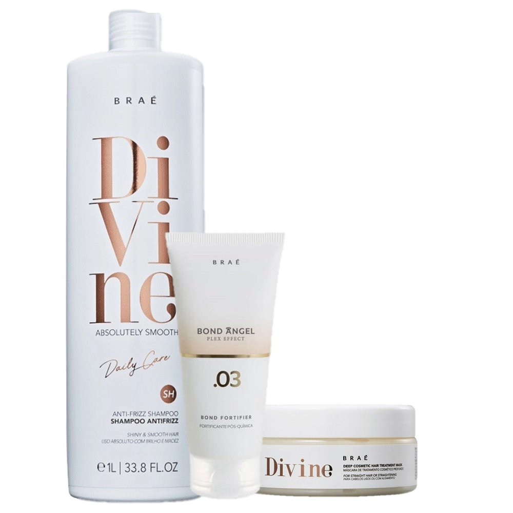 O Shampoo Anti-Frizz Braé Divine limpa delicadamente enquanto hidrata e nutre os fios, controlando o frizz, o volume e alcançando o efeito liso por mais tempo. Indicado para cabelos indisciplinados, rebeldes e com frizz. Sua fórmula especial e com propriedades emolientes agem para fortalecer e proteger a fibra, criando um escudo contra a umidade, deixando os resistente a quebra, ao frizz e ao volume ao mesmo tempo em que hidrata intensamente os fios, conferindo mais controle, disciplina, sedosidade, maciez e brilho. Ideal para quem tem química e deseja manter o efeito liso duradouro. O resultado são cabelos limpos, sedosos, sem frizz e lisos. O processo de reconstrução, deposita nos fios capilares proteínas, aminoácidos e minerais, que são hidratantes essenciais para a estrutura física dos cabelos. Eles tratam as camadas externas dos fios e são responsáveis pelo brilho, maciez e pelo balanço natural das madeixas. Tratamento fortificante para cabelos que passaram por químicas. BRAÉ Bond Angel Plex Effect N°3 Bond Fortifier multiplica as ligações do fio descolorido ou alisado para fortalecer a estrutura e mantém o aspecto bonito. BRAÉ Bond Angel Plex Effect N°3 Bond Fortifier mantém em casa o tratamento feito no salão com os passos N°1 e N°2 de Bond Angel Plex Effect. Sua fórmula é leve e rapidamente absorvida pelo fio, mas ainda assim multiplica e fortalece as pontes de sulfeto da estrutura capilar para prolongar a força do fio pós-química. Ainda aumenta o brilho e maciez.Kit Divine Sh 1L e Masc 250g e Bond Angel Flex Efect 100ml