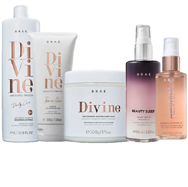 Braé Divine Shampoo 1L Mascara 500g Leave in 200g Revival Shine Oil 60ml e Beauty Sleep 100ml (DESATIVAR)