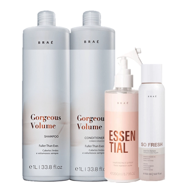 O Kit BRAÉ Gorgeous Volume Duo traz um shampoo e um condicionador desenvolvidos para cuidar e dar um volume incrível aos seus fios. É um banho de brilho e beleza para os cabelos. Os produtos do Kit BRAÉ Gorgeous Volume Duo equilibram a oleosidade do couro cabeludo, fortificam e encorpam a fibra capilar, enquanto hidratam o cabelo. Suas fórmulas equilibram a oleosidade, proporciona mais brilho e volume aos fios. Contém: BRAÉ Gorgeous Volume - Shampoo 1000ml: limpa suavemente os fios enquanto proporciona mais corpo e resistência para a fibra capilar. BRAÉ Gorgeous Volume - Condicionador 1000ml: condiciona e promove maior volume para os fios. BRAÉ ESSENTIAL - 250ML - Biotina (Hvit®) - Pantenol: age profundamente atuando como hidratante de longa duração com ação restauradora e protetora. Melhora a elasticidade e flexibilidade, revitalizando os fios da raiz às pontas. Repara danos causados por tinturas, permanentes e outras químicas, sem pesar os cabelos. - Proteína do Trigo: auxilia na reparação das escamas de queratina de cabelos danificados, dá volume e forma aos fios. - Aminoácidos: aminoácidos são compostos quaternários e fazem parte da construção das proteínas dos cabelos. Uma vez que os fios vão perdendo aminoácidos, é importante repô-los, pois são essenciais nos processos de reconstrução capilar. O Leave-In BRAÉ Essential Fluido Reparador foi especialmente desenvolvido para facilitar a sua rotina de cuidados com os fios. Com formulação exclusiva e ingredientes de alta performance - como os já consagrados Ácido Hialurônico, Monoi Oil, Blend de Aminoácidos, Pantenol e Óleo de Coco -, o produto impede a ação danosa causada pelo calor emitido por ferramentas térmicas, promove brilho intenso, assegura toque macio e ainda protege de agressões externas. Aplique o shampoo sobre os cabelos molhados e massageie o couro cabeludo até a formação de uma espuma cremosa. Enxágue bem e reaplique o produto. Enxágue novamente. Depois, aplique o condicionador e massageie suavemente. Deslize os dedos entre os fios para penteador e faça uma pequena pausa para o produto agir intensamente. Enxágue totalmente. Essential agite antes de usar. Com os cabelos úmidos ou secos, aplique uma pequena quantidade de produto diretamente sobre o comprimento e pontas dos fios. Espalhe bem e finalize com como preferir. O Leave-In BRAÉ Essential Fluido Reparador foi especialmente desenvolvido para facilitar a sua rotina de cuidados com os fios. Com formulação exclusiva e ingredientes de alta performance - como os já consagrados Ácido Hialurônico, Monoi Oil, Blend de Aminoácidos, Pantenol e Óleo de Coco -, o produto impede a ação danosa causada pelo calor emitido por ferramentas térmicas, promove brilho intenso, assegura toque macio e ainda protege de agressões externas. BRAÉ So Fresh - Shampoo a Seco Vegano 150ml Conselho de aplicação Agite bem antes de cada aplicação. Posicione o jato a 30cm dos cabelos e pulverize uniformemente sobre os fios em direção à raiz. Massageie a raiz com as pontas dos dedos e escove para eliminar o excesso. Reaplicar se necessário.BRAÉ Gorgeous Volume Duo 1L Essential 260ml e So Fresh 150ml