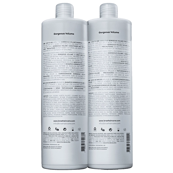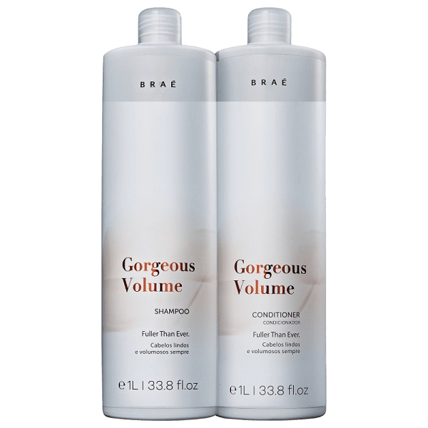 Os produtos do Kit BRAÉ Gorgeous Volume Duo equilibram a oleosidade do couro cabeludo, fortificam e encorpam a fibra capilar, enquanto hidratam o cabelo. Suas fórmulas equilibram a oleosidade, proporciona mais brilho e volume aos fios. Contém: BRAÉ Gorgeous Volume - Shampoo 1000ml: limpa suavemente os fios enquanto proporciona mais corpo e resistência para a fibra capilar. BRAÉ Gorgeous Volume - Condicionador 1000ml: condiciona e promove maior volume para os fios. - Biotina (Hvit®) - Pantenol: age profundamente atuando como hidratante de longa duração com ação restauradora e protetora. Melhora a elasticidade e flexibilidade, revitalizando os fios da raiz às pontas. Repara danos causados por tinturas, permanentes e outras químicas, sem pesar os cabelos. - Proteína do Trigo: auxilia na reparação das escamas de queratina de cabelos danificados, dá volume e forma aos fios. - Aminoácidos: aminoácidos são compostos quaternários e fazem parte da construção das proteínas dos cabelos. Uma vez que os fios vão perdendo aminoácidos, é importante repô-los, pois são essenciais nos processos de reconstrução capilar. Aplique o shampoo sobre os cabelos molhados e massageie o couro cabeludo até a formação de uma espuma cremosa. Enxágue bem e reaplique o produto. Enxágue novamente. Depois, aplique o condicionador e massageie suavemente. Deslize os dedos entre os fios para penteador e faça uma pequena pausa para o produto agir intensamente. Enxágue totalmente.