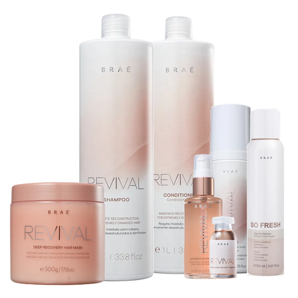 Kit de tratamento completo para cabelos danificados e fragilizados. O Kit BRAÉ Revival Full fortalece os fios da raiz às pontas, além de devolver a vitalidade e a leveza. O Kit BRAÉ Revival Full age internamente nos poros do cabelo para dar estrutura às áreas danificadas. Forma uma camada protetora em torno do fio para deixar o cabelo mais brilhante e resistente, com uma vida nova. Contém BRAÉ Revival - Shampoo 1L: limpa e ajuda na recuperação dos fios desestruturados. BRAÉ Revival - Condicionador 1L: desembaraça e recupera a fibra capilar para trazer força e beleza aos fios. BRAÉ Revival - Máscara de Reconstrução 500g: recupera e protege a fibra capilar para que ela fique forte, brilhante e hidratada. BRAÉ Revival Gorgeous Shine - Óleo Capilar 60ml: nutre e fortalece as pontas, além de devolver a vitalidade aos fios. BRAÉ Revival - Leave-in 200ml: facilita a pentear, nutre e repara os fios de acordo com sua necessidade. BRAÉ Revival Power Dose 13ml: Ampola de tratamento concentrado para cabelos danificados, recupera a fibra capilar desestruturada de maneira imediata. Oferece fios mais brilhantes, fortes e hidratados em poucos minutos. BRAÉ So Fresh Shampoo a Seco 150ml: limpa instantaeamente o couro cabeludo e os fios. Aplique o shampoo nos cabelos molhados e massageie o couro cabeludo até formar espuma. Enxágue. Repita o procedimento se sentir necessidade. Agite a ampola antes de usar. Aplique sobre nos fios limpos e úmidos, enluvando mecha a mecha. Deixe Agir por 3 minutos e enxágue. Distribua a máscara mecha a mecha, começando pelas pontas. Massageie suavemente até chegar próximo à raiz. Deixe agir durante 25 minutos. Enxágue. Finalize como desejar. Espalhe o condicionador sobre os fios úmidos depois de usar o shampoo. Comece pelas pontas, massageie suavemente e deslize os fios entre os dedos até que estejam desembaraçados. Deixe agir por alguns minutos e enxágue. Aplique o leave-in sobre os cabelos secos ou úmidos. Comece pelas pontas até o comprimento, evitando a raiz. Não é necessário enxaguar. Finalize como desejar. Agite antes de usar. Sobre o cabelo limpo e seco, borrife o spray na quantidade desejada. Coloque algumas gotas do óleo na palma das mãos. Espalhe no comprimento dos cabelos até completar a absorção. Finalize como desejar. Agite bem antes de cada aplicação. Posicione o jato a 30cm dos cabelos e pulverize uniformemente sobre os fios em direção à raiz. Massageie a raiz com as pontas dos dedos e escove para eliminar o excesso. Reaplicar se necessário.Brae Revival Kit Salon ( 7 Produtos)