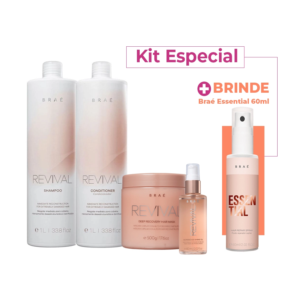1 Shampoo 1L O kit Tratamento Profissional Revival reúne todas as etapas para um cuidado intenso dos fios, através da tecnologia exclusiva da Braé Hair Care. O Shampoo Revival prepara os cabelos para o tratamento condicionante, limpando os poros e tirando as impurezas de cabelos quimicamente tratados. O Condicionador Revival ajuda de uma forma intensa a recuperar os fios danificados, agindo diretamente nos poros e reconstruindo as fibras capilares, trazendo brilho e força novamente. A Máscara Revival restaura os fios danificados e desestruturados. Proporciona mais brilho e força, revitalizando as camadas dos fios, trazendo hidratação e nutrição.Uma nova fase, um novo ciclo. Uma segunda chance para os seus cabelos. O Óleo Revival Gorgeous Shine BRAÉ repõe os lipídios perdidos e sela os fios para que o cabelo fique brilhante, resistente e disciplinado. Com o uso contínuo, a fórmula ainda previne a formação de pontas duplas.Brae Revival Kit Shampoo+Condicionador 1L+Mascara 500g+Shine Oil 60ml