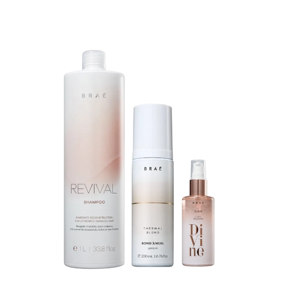 Shampoo para cabelos danificados e fragilizados. BRAÉ Revival Shampoo Reconstrutor ajuda na recuperação dos fios desestruturados. O Shampoo Revival BRAÉ faz uma limpeza suave e prepara o cabelo para receber o tratamento condicionante. Seus compostos vitamínicos ajudam a resgatar gradativamente as camadas sensibilizadas dos fios. Assim, deixa o cabelo mais brilhante e resistente, com uma vida nova. Leave-in matizador para cabelos loiros e grisalhos. BRAÉ Bond Angel Thermal Blond Leave-in conta com ação antifrizz e antiamarelamento enquanto protege do calor do secador e da prancha. O Leave-in Bond Angel Thermal Blond BRAÉ permite com que o tom amarelado se transforme em um platinado de forma simples. Tem propriedades nutritivas e emoliantes que facilitam o pentear, trazem maciez e deixam um brilho saudável nos fios. Sérum reparador para todos os tipos de cabelo. BRAÉ Divine Plume Sensation nutre e combate danos como o frizz e as pontas duplas. Sérum BRAÉ Divine Plume Sensation promove alinhamento das cutículas, impede aspecto pesado nos fios, confere elasticidade e garante toque sedoso. Seu cabelo fica leve e com balanço natural. Braé Revival Shampoo 1L+Bond Angel Leave-in 200ml+Divine Serum Plume 60ml