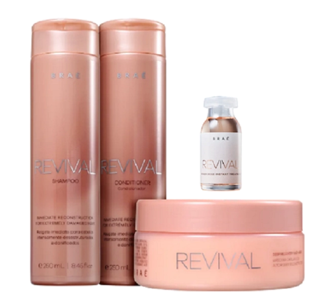 Brae Revival Shampoo+Cond 250ml+Masc 200ml+Power Dose 13ml 1 Shampoo Revival 250ml 1 Condicionador Revival 250ml 1 Mascara de Reconstrução Revival 200g 1 Power Dose Ampola de Tratamento 13ml Shampoo para cabelos danificados e fragilizados. BRAÉ Revival Shampoo Reconstrutor ajuda na recuperação dos fios desestruturados. O Shampoo Revival BRAÉ faz uma limpeza suave e prepara o cabelo para receber o tratamento condicionante. Seus compostos vitamínicos ajudam a resgatar gradativamente as camadas sensibilizadas dos fios. Assim, deixa o cabelo mais brilhante e resistente, com uma vida nova. Conselho de Aplicação Aplique o shampoo nos cabelos molhados e massageie o couro cabeludo até formar espuma. Enxágue. Repita o procedimento se sentir necessidade. Condicionador para cabelos danificados e fragilizados. BRAÉ Revival Condicionador Reconstrutor recupera a fibra capilar para trazer força e beleza aos fios. O Condicionador Revival BRAÉ age internamente nos poros do cabelo para dar estrutura às áreas danificadas. Seus compostos vitamínicos resgatam gradativamente as camadas sensibilizadas dos fios para deixar o cabelo mais brilhante e resistente, com uma vida nova. Conselho de Aplicação Espalhe o condicionador sobre os fios úmidos depois de usar o shampoo. Comece pelas pontas, massageie suavemente e deslize os fios entre os dedos até que estejam desembaraçados. Deixe agir por alguns minutos e enxágue. Máscara de reconstrução para cabelos danificados e fragilizados. BRAÉ Revival Máscara recupera e protege a fibra capilar para que ela fique forte, brilhante e hidratada. A Máscara Revival BRAÉ age internamente nos poros do cabelo para dar estrutura às áreas danificadas. Forma uma camada protetora em torno do fio para deixar o cabelo mais brilhante e resistente, com uma vida nova. Conselho de Aplicação Distribua a máscara mecha a mecha, começando pelas pontas. Massageie suavemente até chegar próximo à raiz. Deixe agir durante 25 minutos. Enxágue. Finalize como desejar. Ampola de tratamento concentrado para cabelos danificados. BRAÉ Revival Power Dose recupera a fibra capilar desestruturada de maneira imediata. Oferece fios mais brilhantes, fortes e hidratados em poucos minutos. A Ampola de Tratamento BRAÉ Revival Power Dose contém óleos de amêndoas, argan e ojon em sua fórmula, que ajudam a regenerar, nutrir e reconstruir todas as camadas da fibra capilar. A ação dos antioxidantes também proporcionam imensa luminosidade e maciez ao cabelo. Conselho de Aplicação Lave o cabelo com shampoo e agite a ampola antes de usar. Aplique sobre os fioslimpos e úmidos, enluvando mecha a mecha. Deixe Agir por 3 minutos e enxágue.