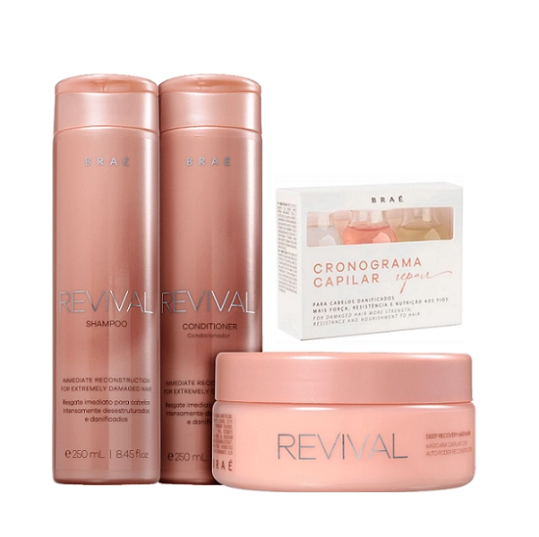 Braé Revival Shampoo+Condicionador 250ml+Mascara 200ml+Cronograma Capilrar Repair Kit 3 Ampolas