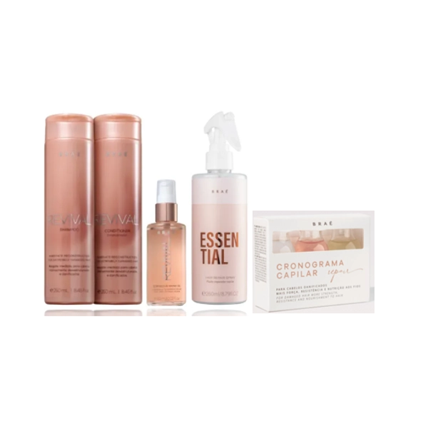 Braé Revival Shampoo+Condicionador 250ml+Shine Oil 60ml+Essential 260ml+Cronograma Capilrar Repair Kit 3 Ampolas