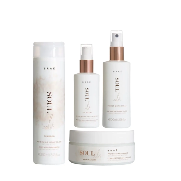 Shampoo leve desenvolvido especialmente para cabelos coloridos ou com mechas, higieniza os fios de forma suave, sua ação antioxidante e nutritiva, protege e renova os fios evitando o desbotamento da cor e os danos a fibra capilar. Máscara extremamente hidratante e nutritiva, desenvolvida especialmente para cabelos coloridos ou com mechas, sela as cutículas evitando que os fios percam os pigmentos depositados no interior da fibra proporcionando maior durabilidade da cor. Desenvolvido com ÓLEO DE AMLA e VITAMINA E, especialmente para cabelos coloridos ou com mechas, Oil Blend Soul Color possui poderosos antioxidantes que auxiliam na proteção da cor. Sua fórmula exclusiva hidrata, nutre e sela as pontas ressecadas, promovendo brilho, maciez e vitalidade aos cabelos coloridos. Desenvolvido especialmente para cabelos coloridos ou com mechas, o Primer Shine Spray é um poderoso leave-in que protege os fios contra o desbotamento, oxidação das cores e ação do calor. Com proteção térmica e UV, ele traz toda a proteção da cor, hidratação, emoliência e brilho intenso que seus fios merecem. Indicado para fios de espessura média à grossa. Cabelos prontos para você sair com o seu style favorito de forma segura e saudável, o brilho perfeito para a sua cor. Para cores muito mais duradouras, reluzentes, fios extremamente nutridos e fortalecidos, Braé Hair Care desenvolveu com a mais alta e exclusiva tecnologia combinando PROTEÍNA DO ARROZ, BLEND DE AMINOÁCIDOS E PANTENOL. Cabelos saudáveis hoje, para fios coloridos por muito mais tempo com SOUL COLOR. COMO USAR Aplique a máscara SOUL COLOR nos cabelos limpos e úmidos, massageie mecha a mecha, deixe agir entre 10 e 20 minutos. Enxágüe totalmente o produto. Aplique o condicionador SOUL COLOR, deixe agir por alguns minutos e enxague. Agite antes de usar. Com os cabelos úmidos ou secos, aplique uma quantidade suficiente para envolver os fios a uma distância de 30 centímetros. Massageie suavemente por todo o comprimento e pontas. Deixe secar natural ou finalize com uma ferramenta de calor, como secadores ou modeladores. Aplique algumas gotas na palma da mão do Oil Blend Soul Color, espalhe entre as duas mãos e aplique nas pontas do cabelo, massageando até sua completa absorção. RESULTADO: TOQUE FINAL LEVE E AVELUDADO, CABELO COM FRAGRÂNCIA BRAÉ Soul Color - Shampoo 250ml+Mascara 200g+Oil Blend 60ml+Prime Spray 100ml