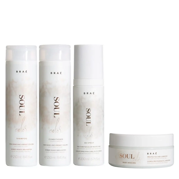 Shampoo leve desenvolvido especialmente para cabelos coloridos ou com mechas, Condicionador hidratante e desembaraçante, desenvolvido especialmente para BB Spray Soul Color é um leave-in com efeito hidratante e desembaraçante, Máscara extremamente hidratante e nutritiva, desenvolvida especialmente para Para cores muito mais duradouras, reluzentes, fios extremamente nutridos e COMO USAR RESULTADO: COR LIVRE DE DESBOTAMENTO, PROTEÇÃO DOS FIOS, FIOS EXTREMAMENTE NUTRIDOS, FORTALECIDOS, LEVES, MALEÁVEIS E COM BRILHO INTENSO. BRAÉ Soul Color - Shampoo+Condicionador 250ml+Leave-in 200ml+Mascara 200g