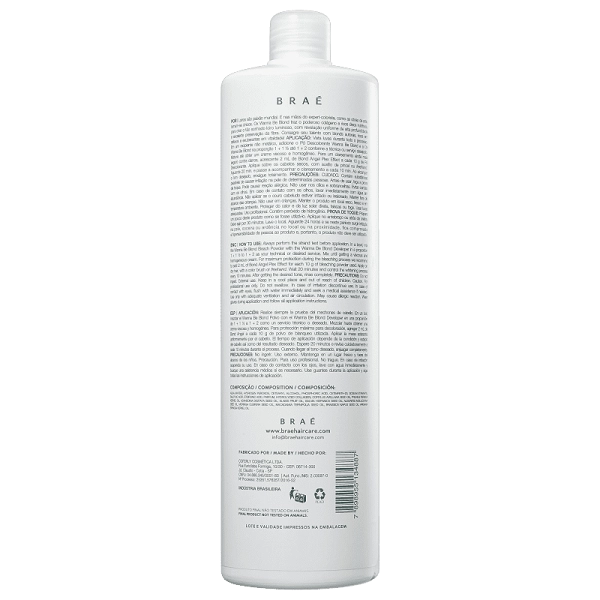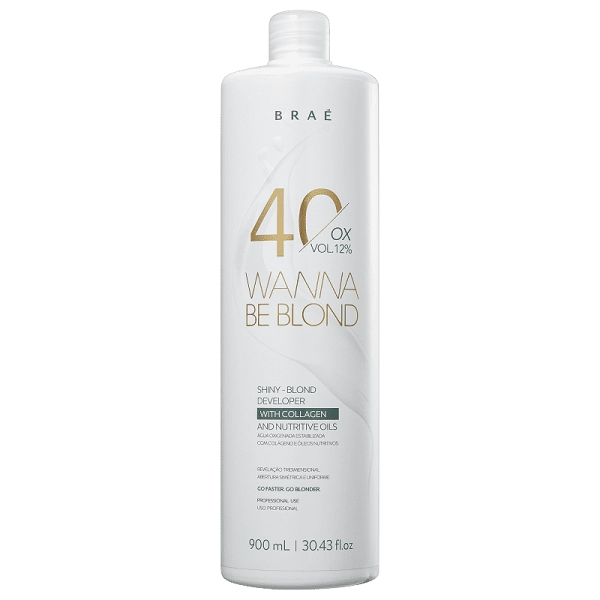 Água oxigena 30 volumes. BRAÉ Wanna Be Blond 40 Volumes clareia até 3 tons para revelar um loiro esplêndido, luminoso e uniforme. Age harmoniosamente com o descolorante Wanna Be Blond. BRAÉ Wanna Be Blond 40 Volumes clareia possui uma fórmula rica em colágeno que preserva o fio dos danos enquanto despigmenta. Além disso, conta com um blend de óleos que ajudam a manter os fios com maciez e brilho depois da coloração. Revela os tons com fidelidade e cuidado máximo. Conselho de Aplicação Siga atentamente os passos na embalagem e folheto explicativo do produto. Leia todas as explicações antes de começar e não pule etapas. Observações - Este produto é para uso exclusivamente profissional. Não recomendamos que você o utilize sem o acompanhamento ou indicação de um profissional. - Antes de aplicar, faça um teste de mecha e teste de toque para verificar se o cabelo está saudável e evitar possíveis alergias. - Se você for gestante, ou estiver é fase de amamentação, procure seu médico para saber se você pode fazer a aplicação do pó descolorante. - Caso você tenha alguma ferida pré-existente no couro cabeludo, não aplique o produto sem consultar seu médico antes BRAÉ Wanna Be Blond 12% Agua Oxigenada 40 Volumes 900ml