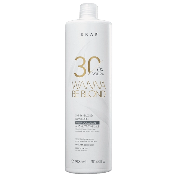 Água oxigena 30 volumes. BRAÉ Wanna Be Blond 30 Volumes clareia até 3 tons para revelar um loiro esplêndido, luminoso e uniforme. Age harmoniosamente com o descolorante Wanna Be Blond. BRAÉ Wanna Be Blond 30 Volumes clareia possui uma fórmula rica em colágeno que preserva o fio dos danos enquanto despigmenta. Além disso, conta com um blend de óleos que ajudam a manter os fios com maciez e brilho depois da coloração. Revela os tons com fidelidade e cuidado máximo. Conselho de Aplicação Siga atentamente os passos na embalagem e folheto explicativo do produto. Leia todas as explicações antes de começar e não pule etapas. Observações - Este produto é para uso exclusivamente profissional. Não recomendamos que você o utilize sem o acompanhamento ou indicação de um profissional. - Antes de aplicar, faça um teste de mecha e teste de toque para verificar se o cabelo está saudável e evitar possíveis alergias. - Se você for gestante, ou estiver é fase de amamentação, procure seu médico para saber se você pode fazer a aplicação do pó descolorante. - Caso você tenha alguma ferida pré-existente no couro cabeludo, não aplique o produto sem consultar seu médico antes BRAÉ Wanna Be Blond 9% Agua Oxigenada 30 Volumes 900ml