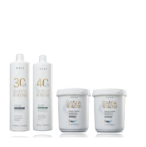 BRAÉ Wanna Be Blond 9% Água oxigena 30 volumes. BRAÉ Wanna Be Blond 30 Volumes clareia até 3 tons para revelar um loiro esplêndido, luminoso e uniforme. Age harmoniosamente com o descolorante Wanna Be Blond. BRAÉ Wanna Be Blond 30 Volumes clareia possui uma fórmula rica em colágeno que preserva o fio dos danos enquanto despigmenta. Além disso, conta com um blend de óleos que ajudam a manter os fios com maciez e brilho depois da coloração. Revela os tons com fidelidade e cuidado máximo. Ação Crotein H: proteína hidrolisada derivada do colágeno que protege a fibra capilar durante o processo de descoloração. BRAÉ Wanna Be Blond 12% Água oxigenada 40 volumes. BRAÉ Wanna Be Blond 40 Volumes clareia até 4 tons para revelar loiros platinados ou clarear fios escuros naturalmente. Ilumina tons de maneira uniforme e age harmoniosamente com o descolorante Wanna Be Blond de BRAÉ. BRAÉ Wanna Be Blond 40 Volumes possui uma fórmula rica em colágeno que preserva a fibra capilar durante a descoloração, para que não fique muito danificada. Além disso, seu blend de óleos proporciona mais maciez, brilho e maleabilidade no pós-coloração. Ação Crotein H: proteína hidrolisada derivada do colágeno que protege a fibra capilar durante o processo de descoloração. BRAÉ Wanna Be Blond Pó descolorante. Descolorante BRAÉ Wanna Be Blond clareia até 9 tons de maneira uniforme para criar loiros claros esplendorosos. Preserva a fibra e proporciona máxima luminosidade. O Pó Descolorante BRAÉ Wanna Be Blond possui fórmula rica em colágeno que preserva o fio, para que você conquiste tons altos sem abrir mão da saúde do fio. Ainda conta com tecnologia que proporciona um cabelo macio, com brilho e maleável após a descoloração. Ideal para clareamentos completos ou mechas pontuais. Ação Crotein H: proteína hidrolisada derivada do colágeno que protege a fibra capilar durante o processo de descoloração. BRAÉ Wanna Be Blond 9% Conselho de Aplicação Siga atentamente os passos na embalagem e folheto explicativo do produto. Leia todas as explicações antes de começar e não pule etapas. Observações - Este produto é para uso exclusivamente profissional. Não recomendamos que você o utilize sem o acompanhamento ou indicação de um profissional. - Antes de aplicar, faça um teste de mecha e teste de toque para verificar se o cabelo está saudável e evitar possíveis alergias. - Se você for gestante, ou estiver é fase de amamentação, procure seu médico para saber se você pode fazer a aplicação do pó descolorante. - Caso você tenha alguma ferida pré-existente no couro cabeludo, não aplique o produto sem consultar seu médico antes. Resultado Fios descoloridos com uniformidade e resultado luminoso, com a fibra capilar preservada. BRAÉ Wanna Be Blond 12% Conselho de Aplicação Siga atentamente os passos na embalagem e folheto explicativo do produto. Leia todas as explicações antes de começar e não pule etapas. Observações - Este produto é para uso exclusivamente profissional. Não recomendamos que você o utilize sem o acompanhamento ou indicação de um profissional. - Antes de aplicar, faça um teste de mecha e teste de toque para verificar se o cabelo está saudável e evitar possíveis alergias. - Se você for gestante, ou estiver é fase de amamentação, procure seu médico para saber se você pode fazer a aplicação do pó descolorante. - Caso você tenha alguma ferida pré-existente no couro cabeludo, não aplique o produto sem consultar seu médico antes. Resultado Fios claros, iluminados ou platinados em tons esplêndidos. Maciez, brilho e maleabilidade para o cabelo, com menos danos. BRAÉ Wanna Be Blond Conselho de Aplicação Siga atentamente os passos na embalagem e folheto explicativo do produto. Leia todas as explicações antes de começar e não pule etapas. Observações - Este produto é para uso exclusivamente profissional. Não recomendamos que você o utilize sem o acompanhamento ou indicação de um profissional. - Antes de aplicar, faça um teste de mecha e teste de toque para verificar se o cabelo está saudável e evitar possíveis alergias. - Se você for gestante, ou estiver é fase de amamentação, procure seu médico para saber se você pode fazer a aplicação do pó descolorante. - Caso você tenha alguma ferida pré-existente no couro cabeludo, não aplique o produto sem consultar seu médico antes. Resultado Fios mais claros em um loiro encantador. Luminosos, macios, maleáveis e com manos danos. Na mistura com o oxidante, adicione o tratamento Bond Angel Flex Effect N°1 para fortalecer o fio e impedir o dano.BRAE Wanna Be Blond Água Oxigenada 30 Volumes 900ml+Água Oxigenada 40v 900ml+2 Pó Descolorante 500g