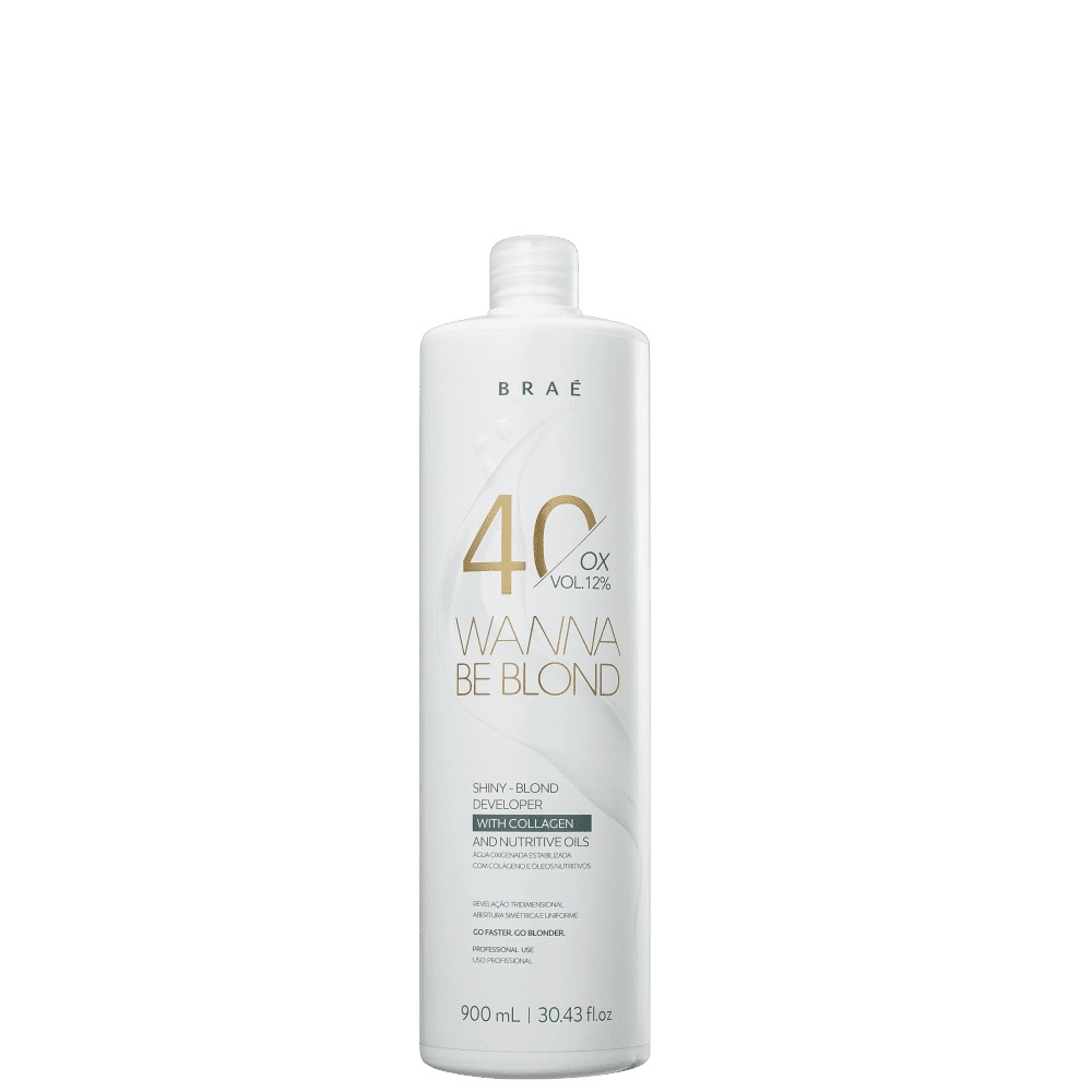 Água oxigena 30 volumes. BRAÉ Wanna Be Blond 40 Volumes clareia até 3 tons para revelar um loiro esplêndido, luminoso e uniforme. Age harmoniosamente com o descolorante Wanna Be Blond. BRAÉ Wanna Be Blond 40 Volumes clareia possui uma fórmula rica em colágeno que preserva o fio dos danos enquanto despigmenta. Além disso, conta com um blend de óleos que ajudam a manter os fios com maciez e brilho depois da coloração. Revela os tons com fidelidade e cuidado máximo. Conselho de Aplicação Siga atentamente os passos na embalagem e folheto explicativo do produto. Leia todas as explicações antes de começar e não pule etapas. Observações - Este produto é para uso exclusivamente profissional. Não recomendamos que você o utilize sem o acompanhamento ou indicação de um profissional. - Antes de aplicar, faça um teste de mecha e teste de toque para verificar se o cabelo está saudável e evitar possíveis alergias. - Se você for gestante, ou estiver é fase de amamentação, procure seu médico para saber se você pode fazer a aplicação do pó descolorante. - Caso você tenha alguma ferida pré-existente no couro cabeludo, não aplique o produto sem consultar seu médico antes BRAÉ Wanna Be Blond Agua Oxigenada 40 Volumes 900ml