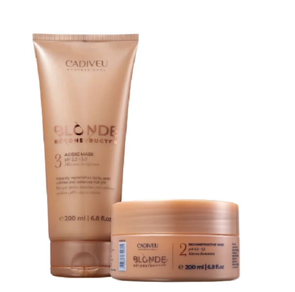 Kit com máscara de reconstrução e máscara acidificante para cabelos loiros. Cadiveu Blonde Reconstructor Masks condiciona e regenera os fios danificados durante o processo de descoloração. O Kit Cadiveu Blonde Reconstructor Masks promove ação intensiva e imediata na recuperação da estrutura da fibra capilar, onde promove um cabelo loiro com tom incrível, superbrilhante e maleável. Contém: Cadiveu Blonde Reconstrutive - Máscara de Reconstrução 200ml: Condiciona e recupera a estrutura da fibra capilar danificada pela descoloração. Cadiveu Blonde Acidic - Máscara Acidificante 200ml: Máscara acidificante para cabelos loiros. Cadiveu Blonde Acidic regenera de maneira intensiva e diminui a porosidade dos fios danificados pelo processo químico. Após limpar os cabelos com o Shampoo Cavideu Blonde Keeper, aplique a Máscara Blonde Reconstrutive nos fios úmidos, comprimento e pontas, e penteie para melhor distribuição. Não enxágue e, em seguida, aplique a Máscara Cadiveu Blonde Acidic. Espalhe o creme uniformemente em todo comprimento e faça uma pausa de 3 a 5 minutos. Enxágue para retirar os produtos e finalize normalmente. ResultadoCadiveu Blonde Reconstructor Mascara de Reconstrução+Acidificante 200ml