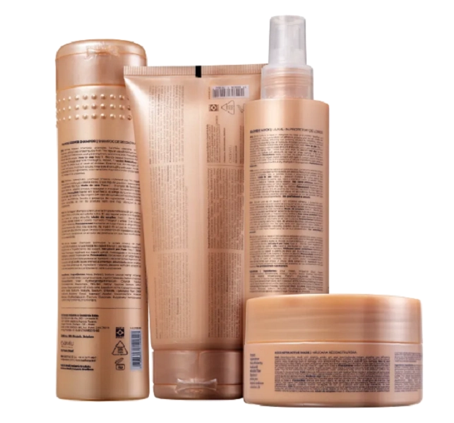 Kit com shampoo, máscara de reconstrução, máscara acidificante e leave-in para cabelos loiros. Cadiveu Blonde Reconstructor é o sistema que previne e reconstrói de maneira absoluta os danos causados pelo processo de descoloração. O Kit Cadiveu Blonde Reconstructor ajuda a conquistar um loiro saudável e fabuloso! Formulado especialmente para combater de forma imediata os 5 principais problemas do cabelo descolorido: porosidade, quebra, frizz, amarelamento e esverdeamento por piscina. Contém: Cadiveu Blonde Keeper - Shampoo Reconstrutor 250ml: Limpa suavemente, sem agredir os fios loiros, e promove brilho incrível desde a primeira lavagem. Cadiveu Blonde Reconstrutive - Máscara de Reconstrução 200ml: Recupera a estrutura da fibra capilar danificada pela descoloração e condiciona. Cadiveu Blonde Acidic - Máscara Acidificante 200ml: Ajuda a regenerar de maneira intensiva e diminui a porosidade dos fios danificados pelo processo químico. Cadiveu Blonde Lock - Leave-in com Filtro Solar 200ml: Desembaraça, protege dos raios UV, condiciona e previne o amarelamento e o esverdeamento dos fios pós piscina e mar. Passo 1 - Shampoo Reconstrutor: aplique sobre os cabelos úmidos e massageie até formar espuma. Enxágue e repita a operação, se necessário. Passo 2 – Máscara de Reconstrução: Com os fios já limpos e úmidos, aplicar no comprimento e pontas. Penteie para melhor distribuição e não enxague. Em sobreposição, aplicar o Passo 3 – Máscara Acidificante. Após o Passo 2, não enxaguar os fios e aplicar a máscara acidificante no comprimento e pontas dos fios. Pentear para melhor distribuição e deixar agir de 3 a 5 minutos, após a pausa enxaguar completamente. Passo 4 - Leave-in Protetor de Loiros: Aplicar uma pequena quantidade na palma das mãos e distribuir sobre os cabelos úmidos. Pentear os cabelos e finalizar como desejar. Para o uso como protetor, aplique uma generosa quantidade sobre os fios e espalhar bem para proteção térmica e antes de exposição ao sol e banho no mar ou piscina. Cadiveu Blonde Reconstructor Shampoo 250ml+Mascara Reconstrução+Acidificante+Leave-in 200ml
