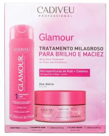 Kit Cadiveu Professional Glamour Glossy Rubi Kit Cadiveu Professional Glamour Glossy Rubi é ideal para os fios que passaram por processos químicos como escova progressiva, coloração e descoloração. Age no interior da fibra para recuperá-la dos danos sofridos enquanto protege e promove disciplina, maciez e muito brilho. Contém Cadiveu Professional Glamour - Shampoo Rubi 250ml: limpa com eficácia sem agredir os fios, nutre e fortalece, restaura os cabelos. Cadiveu Professional Glamour Glossy - Máscara de Tratamento 200ml: oferece a disciplina dos fios com nutrição profunda. Ação Sugarcane Cysteine (Cisteína da Cana-de-açúcar) e Micropartículas de Rubi, que agem nas camadas profundas das cutículas dos fios, devolvendo maciez e suavidade aos cabelos. Cisteína: Aminoácido responsável pela recuperação dos fios, regenerando-os desde seu interior. Estimula o crescimento de fios saudáveis e estimula a atividade celular. Micropartículas de Rubi: Responsável pela selagem dos fios. Forma uma barreira protetora, protegendo os cabelos contra as agressões ambientais e mecânicas, como uso de secador e chapinha. Promove um brilho intenso e duradouro, devido a sua cintilância natural. Manteiga de Karitê: rico em Ômega 6 e 9, restaura a maciez natural de fios saudáveis. Proteína do Trigo: aminoácido que alinha as cutículas e protege contra a oxidação. Como Usar Em seguida, distribua a máscara sobre o comprimento e pontas do cabelo. Deixe agir por 5 minutos e enxágue. Resultado