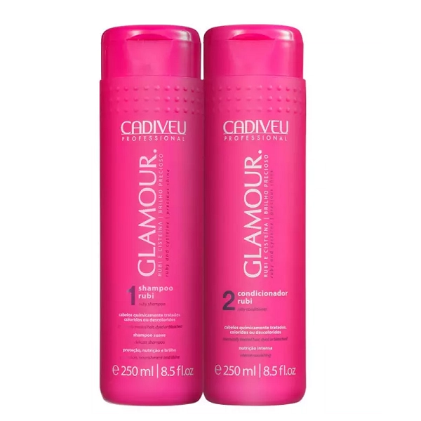 Kit de tratamento para cabelos quimicamente tratados, coloridos ou descoloridos. Nutre e fortalece os fios de dentro para fora, restaurando a saúde do cabelo. Hidrata e elimina o frizz. Protege a cor dos fios tingidos ao mesmo que acentua a cor e o efeito liso do alisamento. Ação Shampoo: Distribua uma pequena quantidade por todo cabelo, massageando suavemente até a formação de espuma e enxague completamente em seguida. Condicionador: Após lavar com o shampoo, retire o excesso de água delicadamente com a ajuda de uma toalha. Aplique uma pequena quantidade do comprimento as pontas, penteie para maior distribuição, massageie suavemente e enxague em seguida. Resultado Seus cabelos são limpos sem perder a integridade. Seus fios ganham força, nutrição e mais brilho!Cadiveu Professional Glamour Rubi- Shampoo+Condicionador 250ml