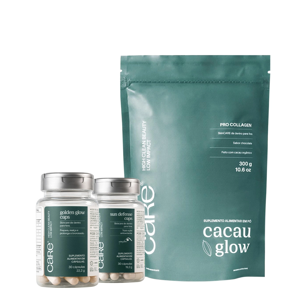 Este Kit Contém Care Natural Beauty Sun Defense Caps - Suplemento em Cápsulas 19,2g: suplemento alimentar em cápsula com tripla ação oxidante, ajuda a proteger a pele dos raios solares, combate o stress oxidativo e diminui os impactos do envelhecimento, como rugas e linhas finas. Sua formulação vegana e inovadora possui ativos biotecnológicos como Opextan®* (ativo patenteado), que tem alto poder anti-inflamatório, característica fundamental para redução de queimadura solar e prevenção do fotoenvelhecimento. Care Natural Beauty Cacau Glow - Estimulador de Colágeno 300g: estimula o corpo a produzir a quantidade diária necessária de colágeno para melhorar o aspecto e a saúde da pele, além de promover o bom funcionamento do organismo. Sendo uma alternativa vegana ao colágeno tradicional, vai potencializar a sua rotina de beleza limpa e incentivar hábitos mais saudáveis para sua pele, para você e para o planeta.Care Natural Beauty Golden Glow Caps Cacau Glow e Sun Defense Caps (3 produtos)