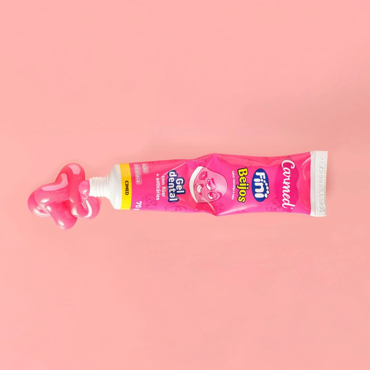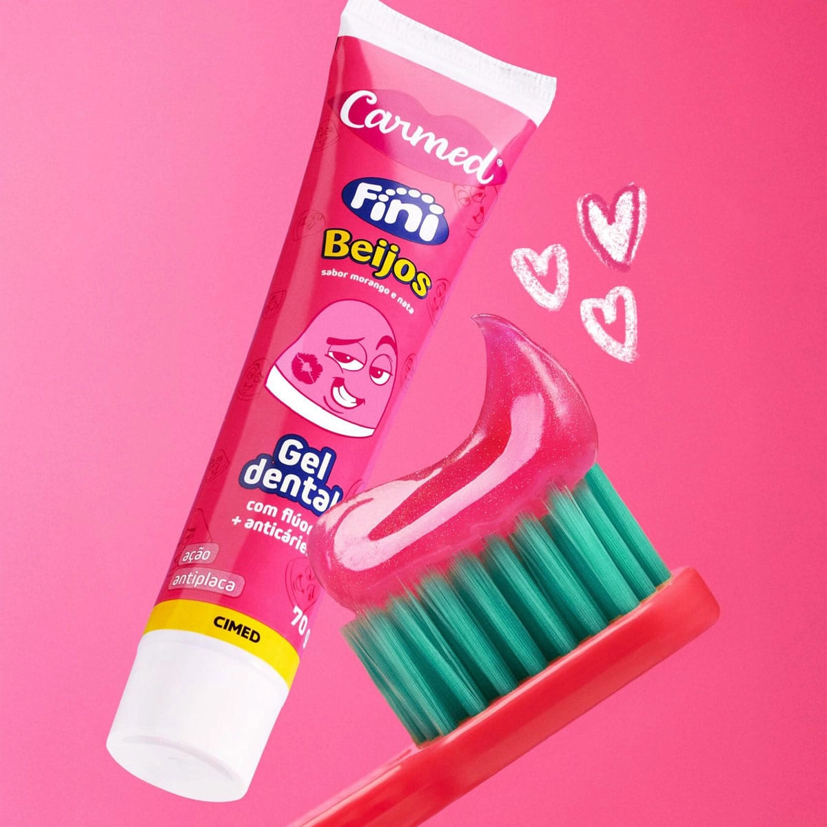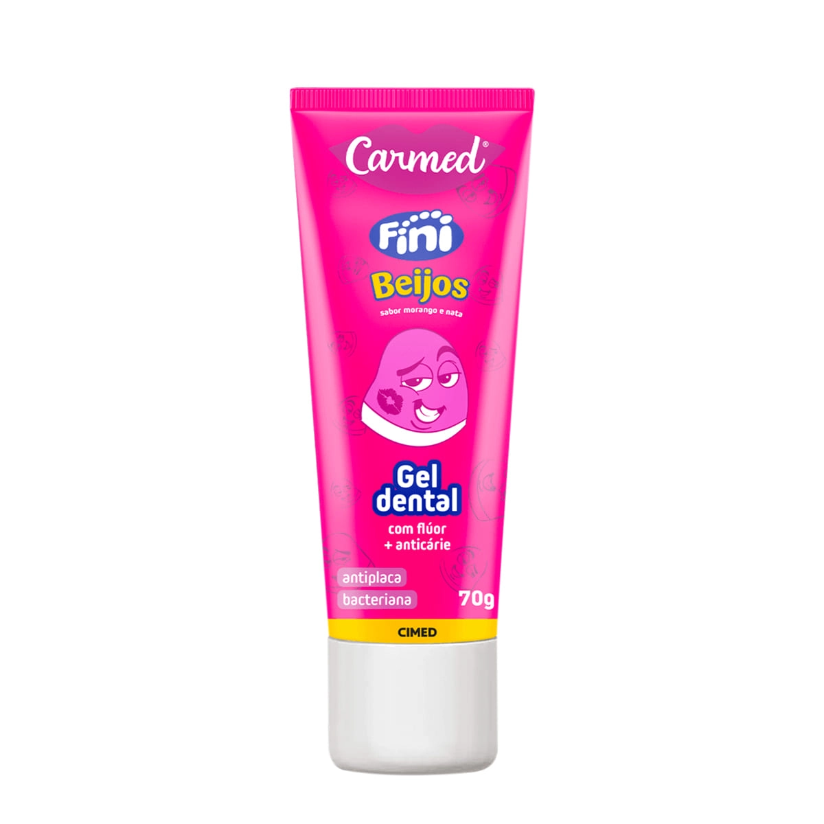 Carmed Fini Beijos - Gel Dental 70g Inspirado nas famosas guloseimas Fini, o Gel Dental Carmed Beijos possui um sabor doce e irresistível. Realiza uma limpeza eficiente, suave e com frescor duradouro. Enriquecido com flúor, promove gengivas mais saudáveis e protegidas contra placas e cáries.
