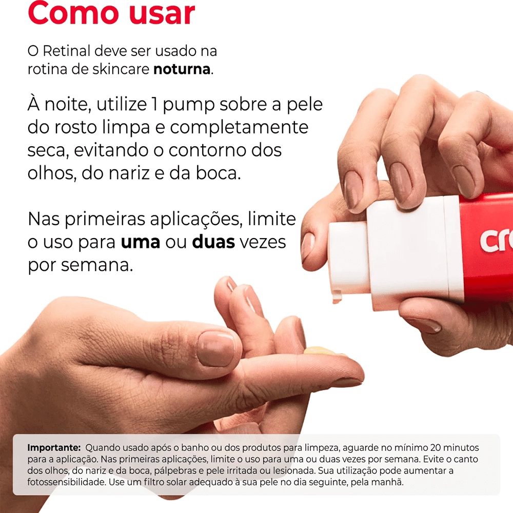 À noite, utilize 1 pump sobre a pele do rosto limpa e completamente seca, evitando o contorno dos olhos, do nariz e da boca. Nas primeiras aplicações, limite o uso para uma ou duas vezes por semana. O Sérum Retinal é de uso exclusivo noturno. Sua utilização pode aumentar a fotossensibilidade, por isso aplique sempre um filtro solar de alta proteção durante o dia.