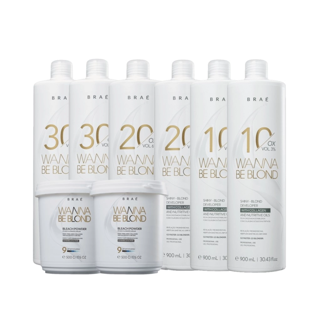 Braé Wanna Be Blond Água Oxigenada 10V 900ml+Água Oxigenada 20V 900ml+Água Oxigenada 30v+3 Pó Descolorantes 500g