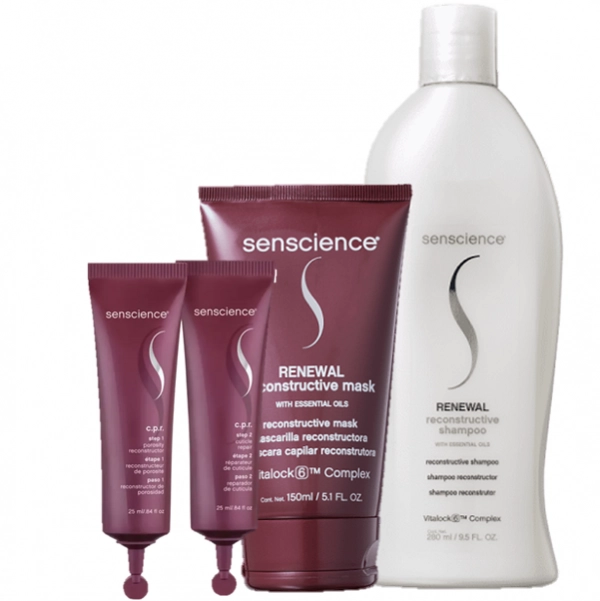 Senscience Renewal Shampoo 280ml Renewal Mask 150ml e CPR Tratamento Reconstrutor 2x25ml