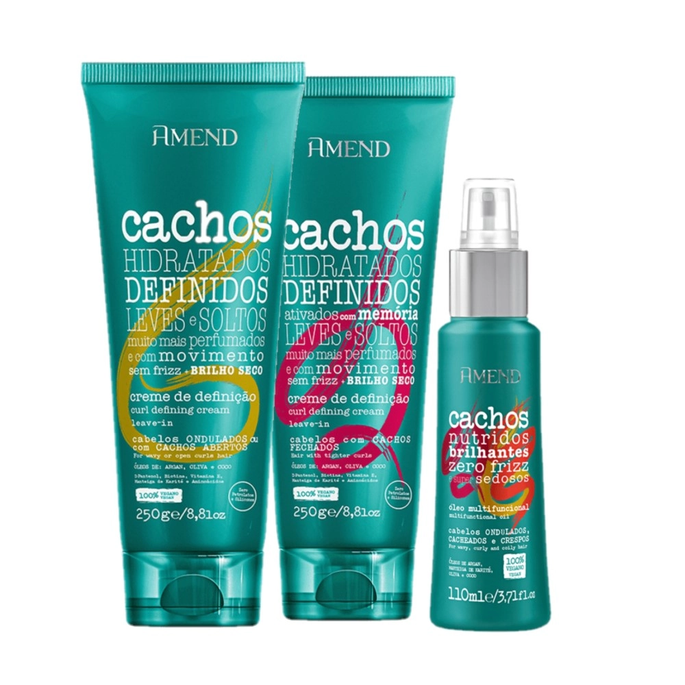Kit Amend Cachos Nutridos Brilhantes Oléo Multifuncional Cachos Ondulados e Abertos + Leave-in Fechados (3 Produtos)