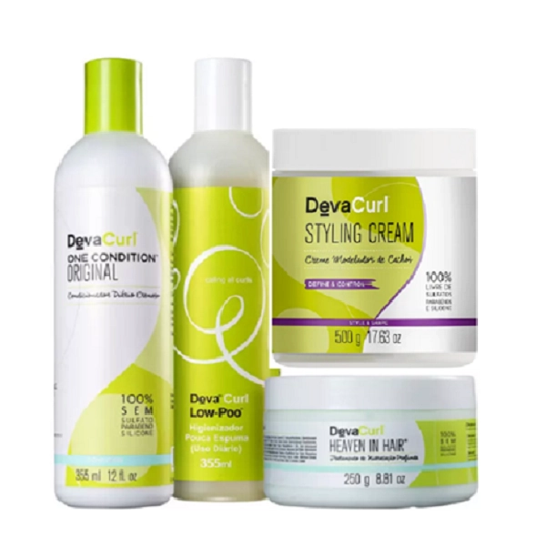 Deva Curl Shampoo Low-Poo+Condicionador One Condition 355ml+Heaven in Hair Tratamento 250ml+Creme Modelador 500ml