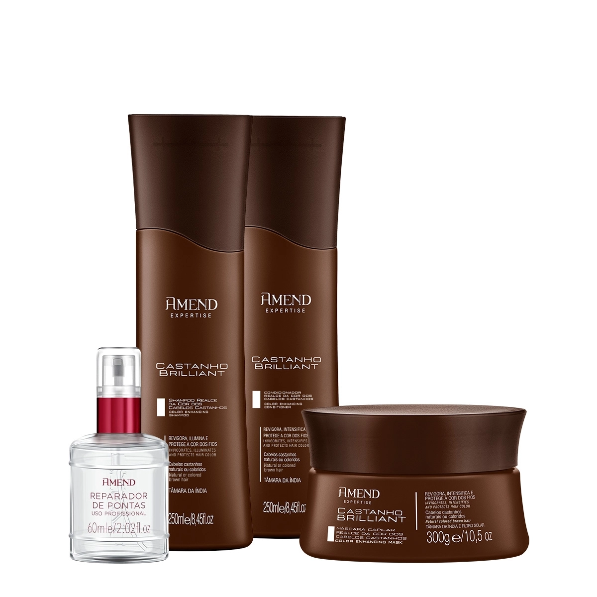 Kit Amend Castanho Brilliant Realce da Cor Shampoo Condicionador Máscara e Reparador de Pontas (4 Produtos)